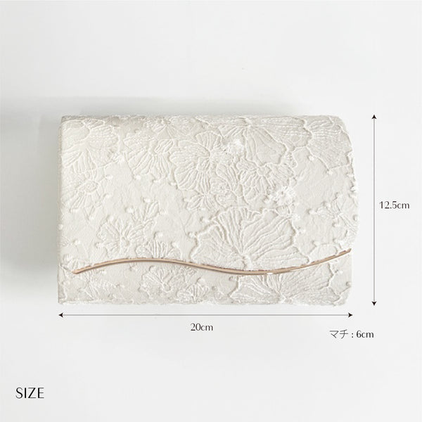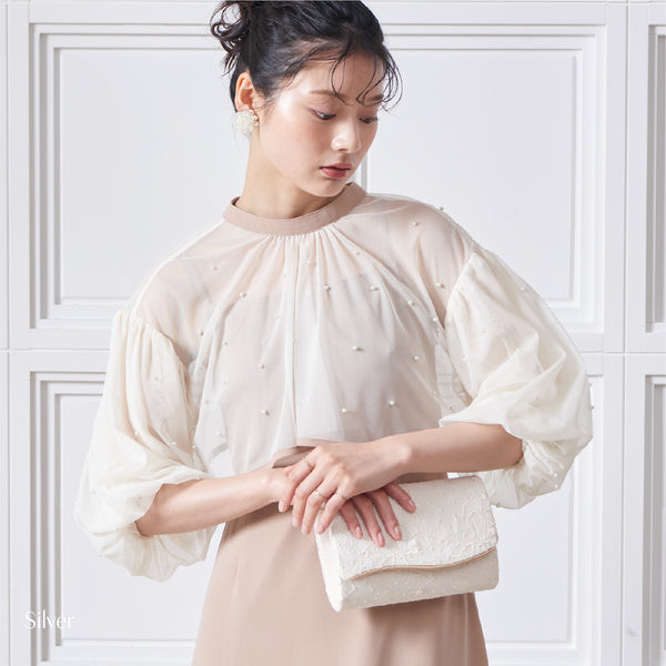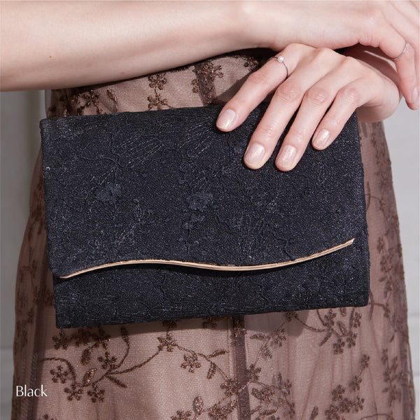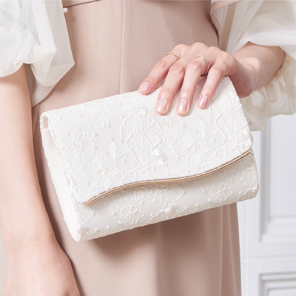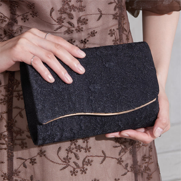 華やかなスパンコール刺繍レースをあしらったエレガントなパーティーバッグ。繊細な刺繍が上品な輝きを放ち、結婚式や食事会、同窓会などのフォーマルなシーンで活躍します。