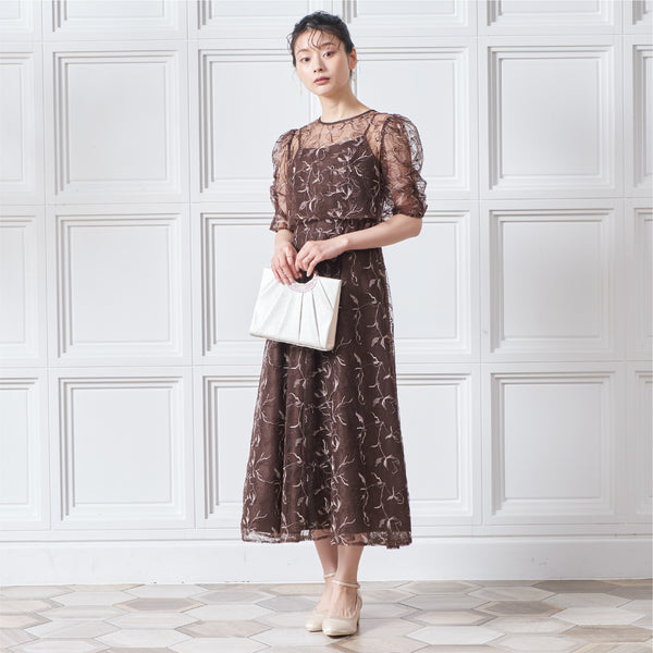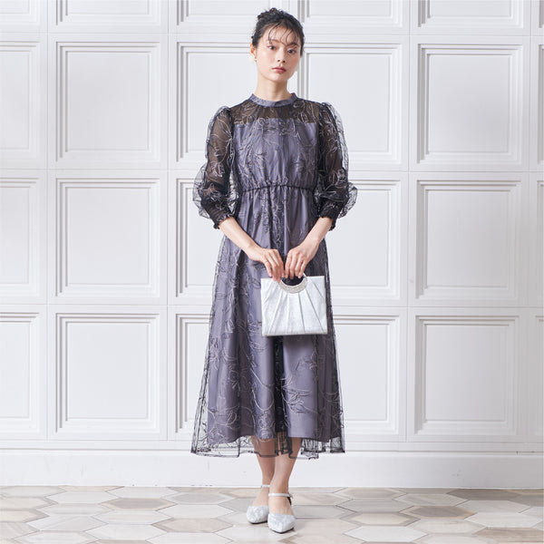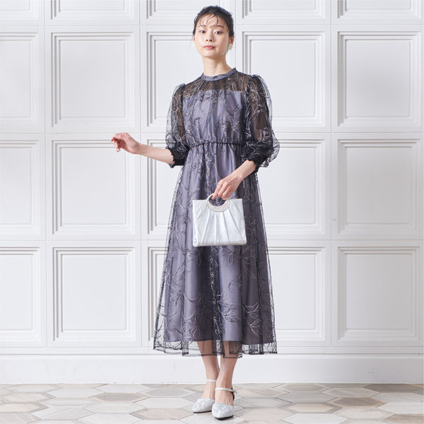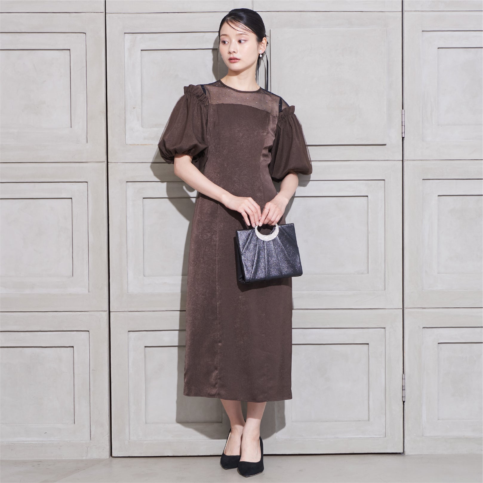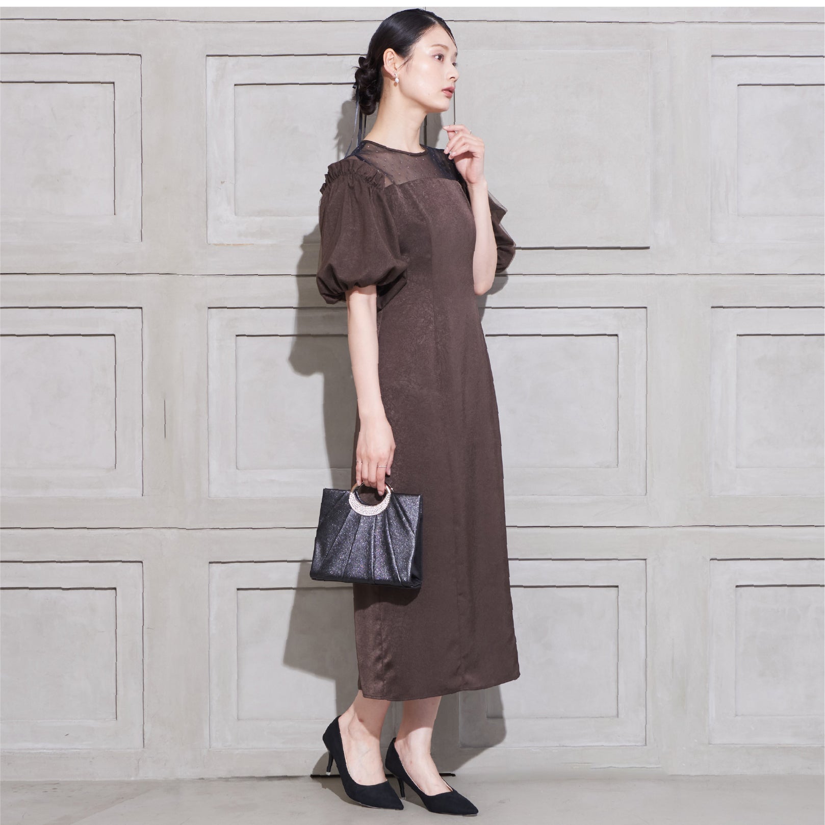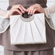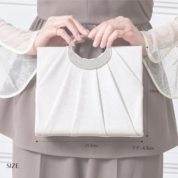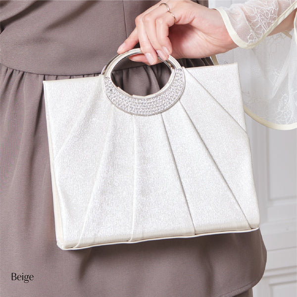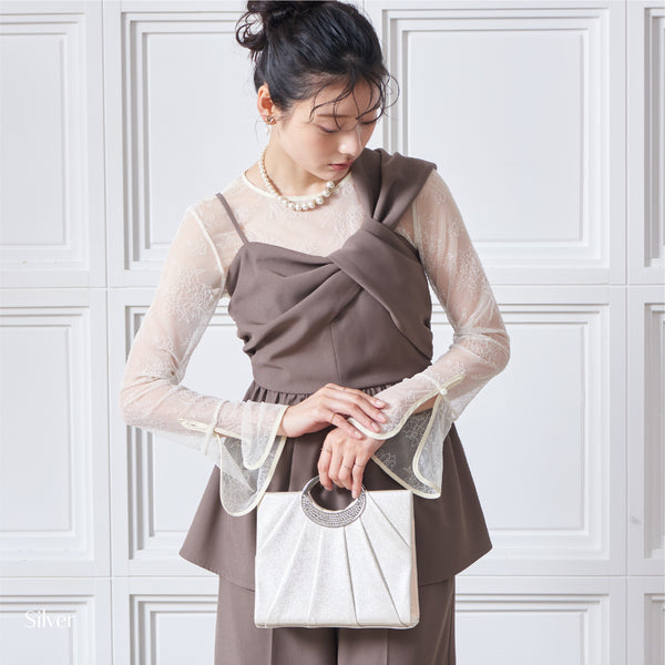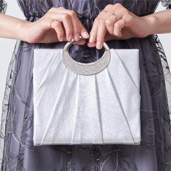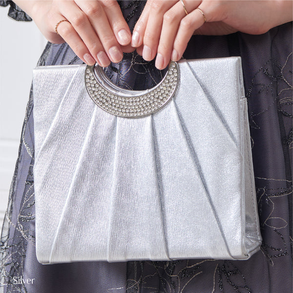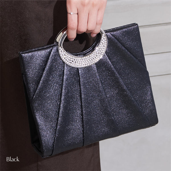 エレガントで洗練されたコンパクトデザインのハンドバッグです。キラキラとしたラメ合皮とハンドル部分にラインストーンを使用しており上品な輝きが印象的です。