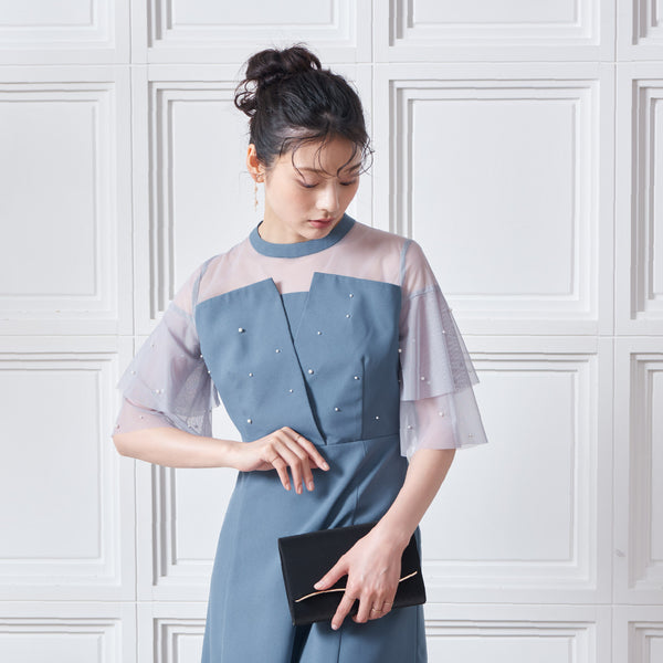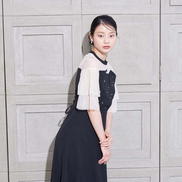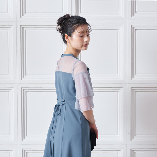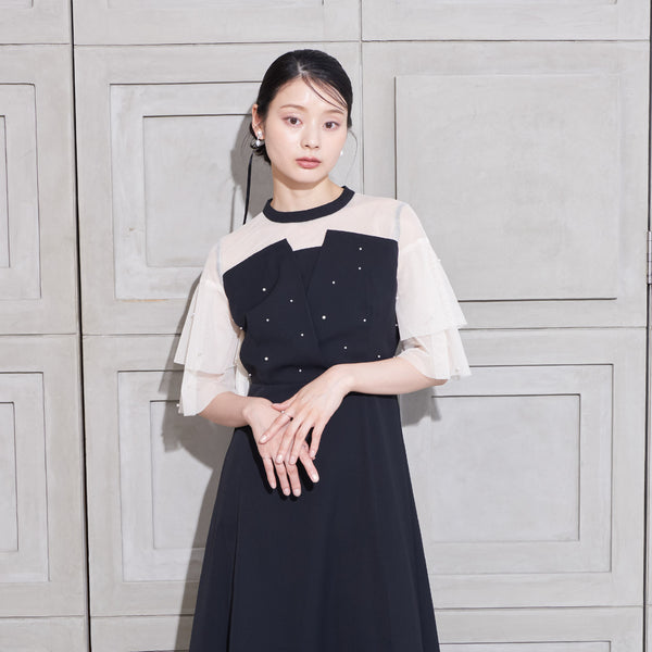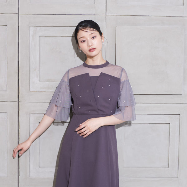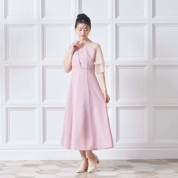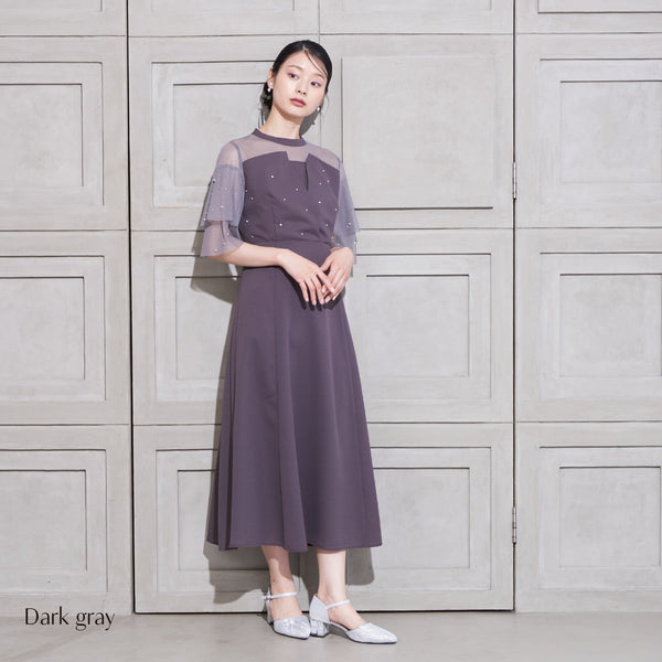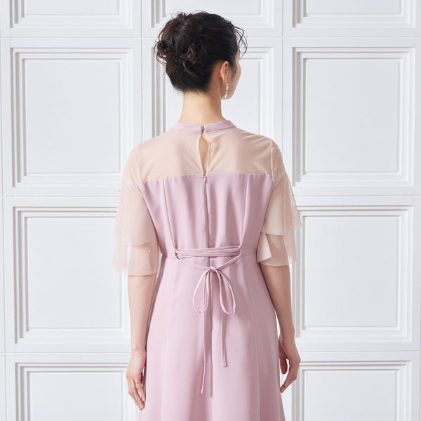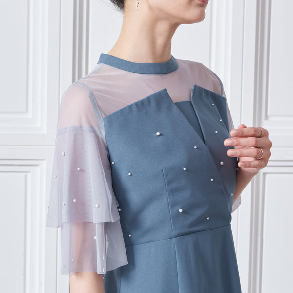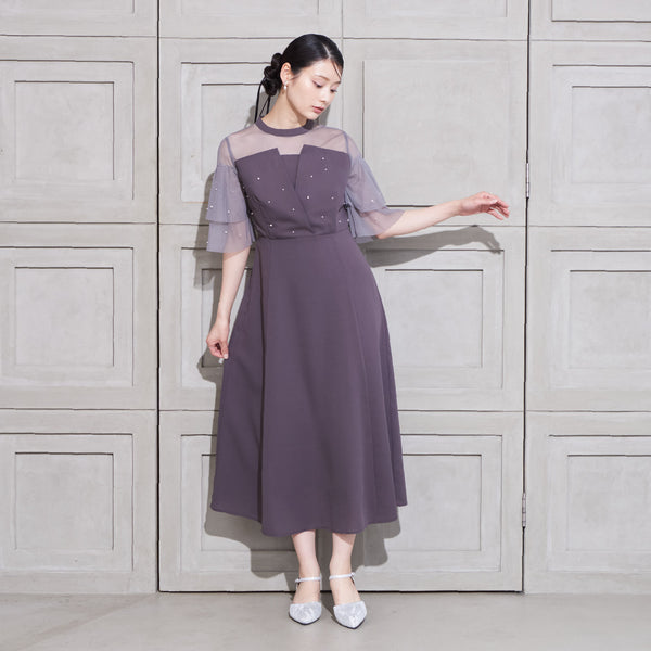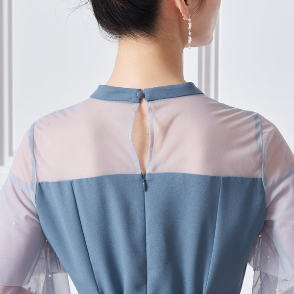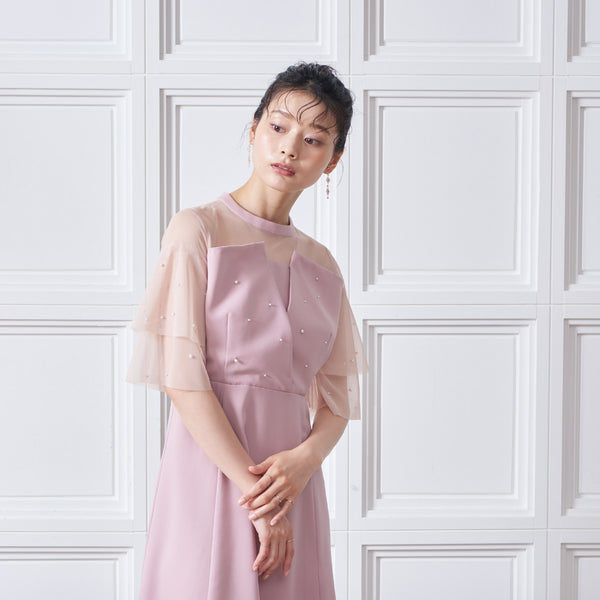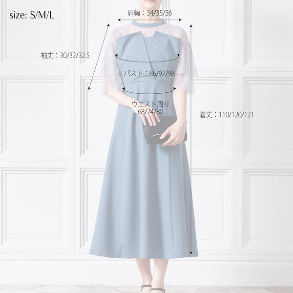 繊細なビジューを散りばめ、さりげない輝きを添えた上品なドレス。透明感のあるシアー素材を使用したヨーク部分とフリルスリーブが、軽やかでフェミニンな印象を演出します。程よく広がるAラインシルエットで、体型を美しく見せながら動きやすさも兼ね備えた一枚です。