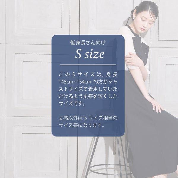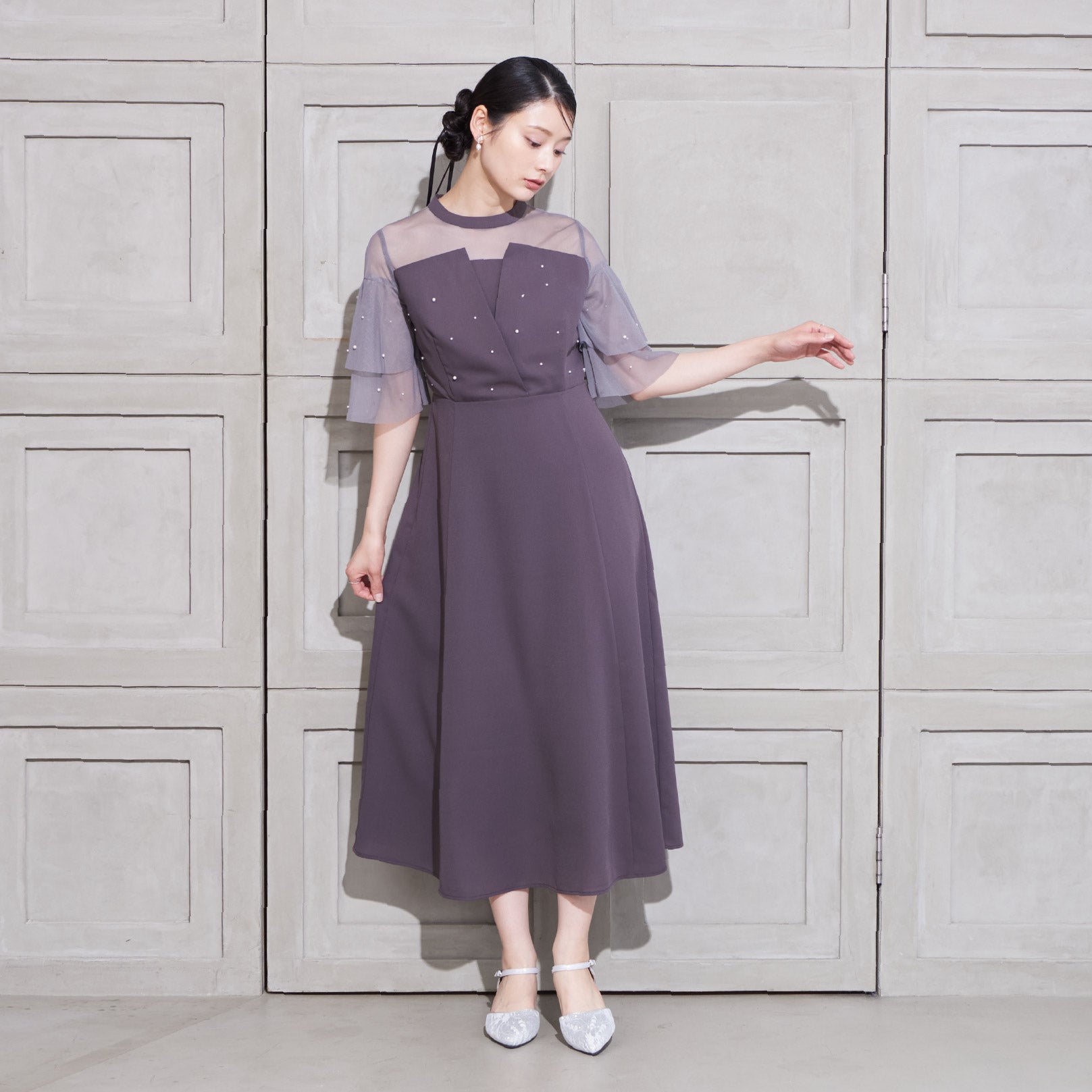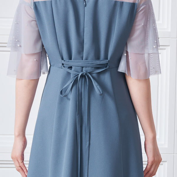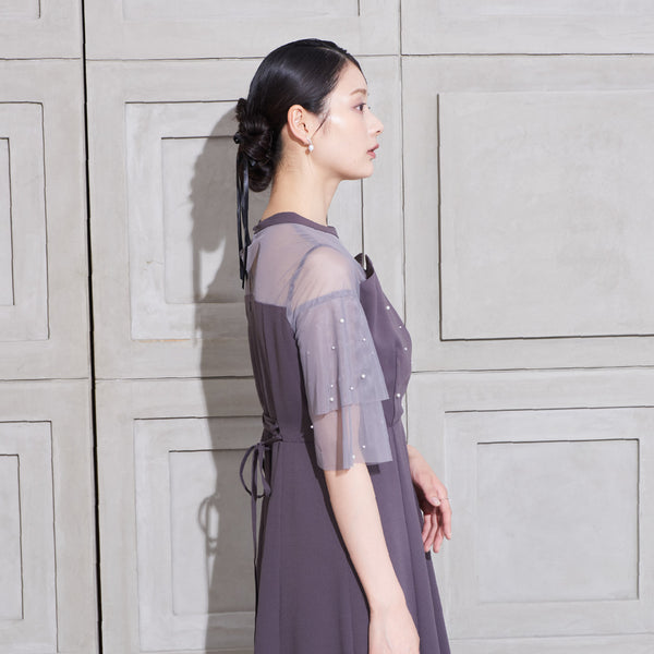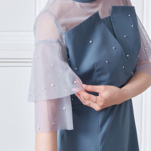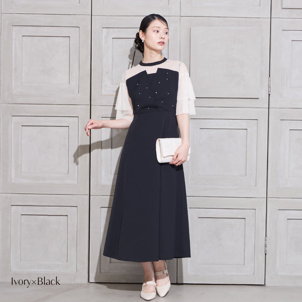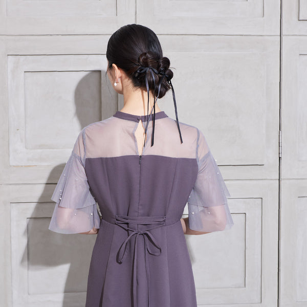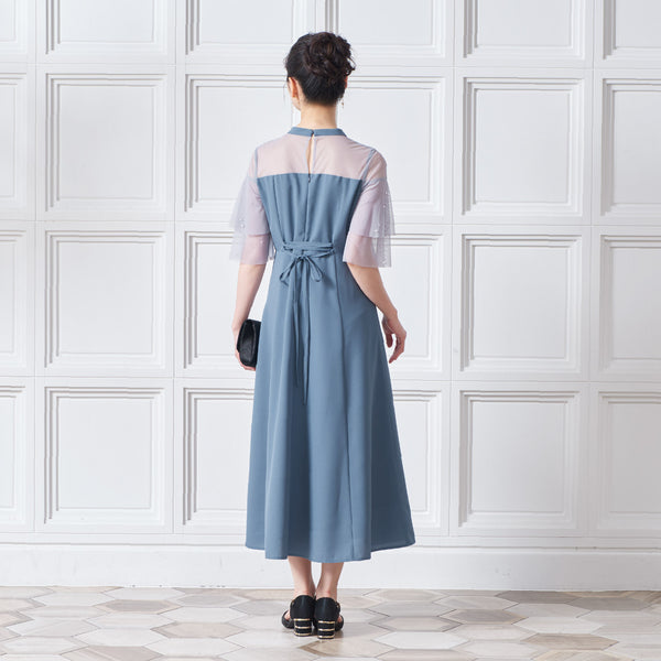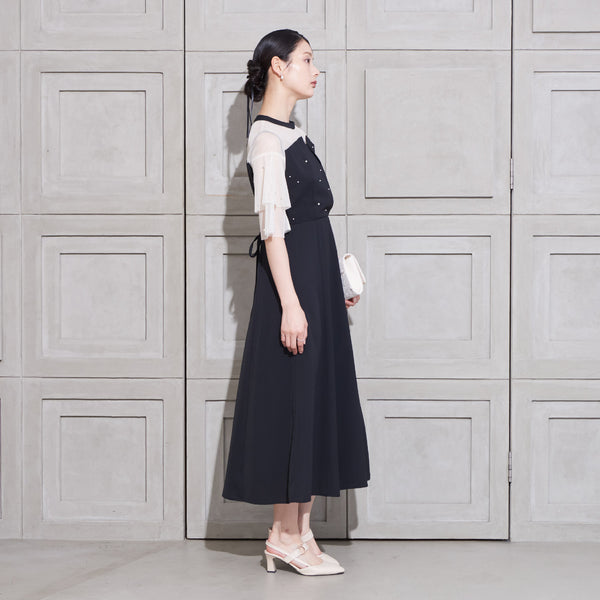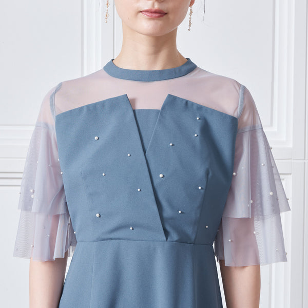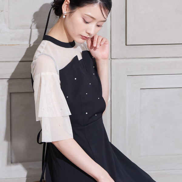 繊細なビジューを散りばめ、さりげない輝きを添えた上品なドレス。透明感のあるシアー素材を使用したヨーク部分とフリルスリーブが、軽やかでフェミニンな印象を演出します。程よく広がるAラインシルエットで、体型を美しく見せながら動きやすさも兼ね備えた一枚です。