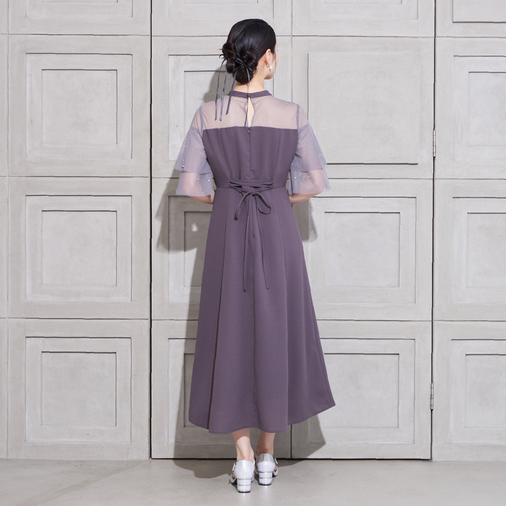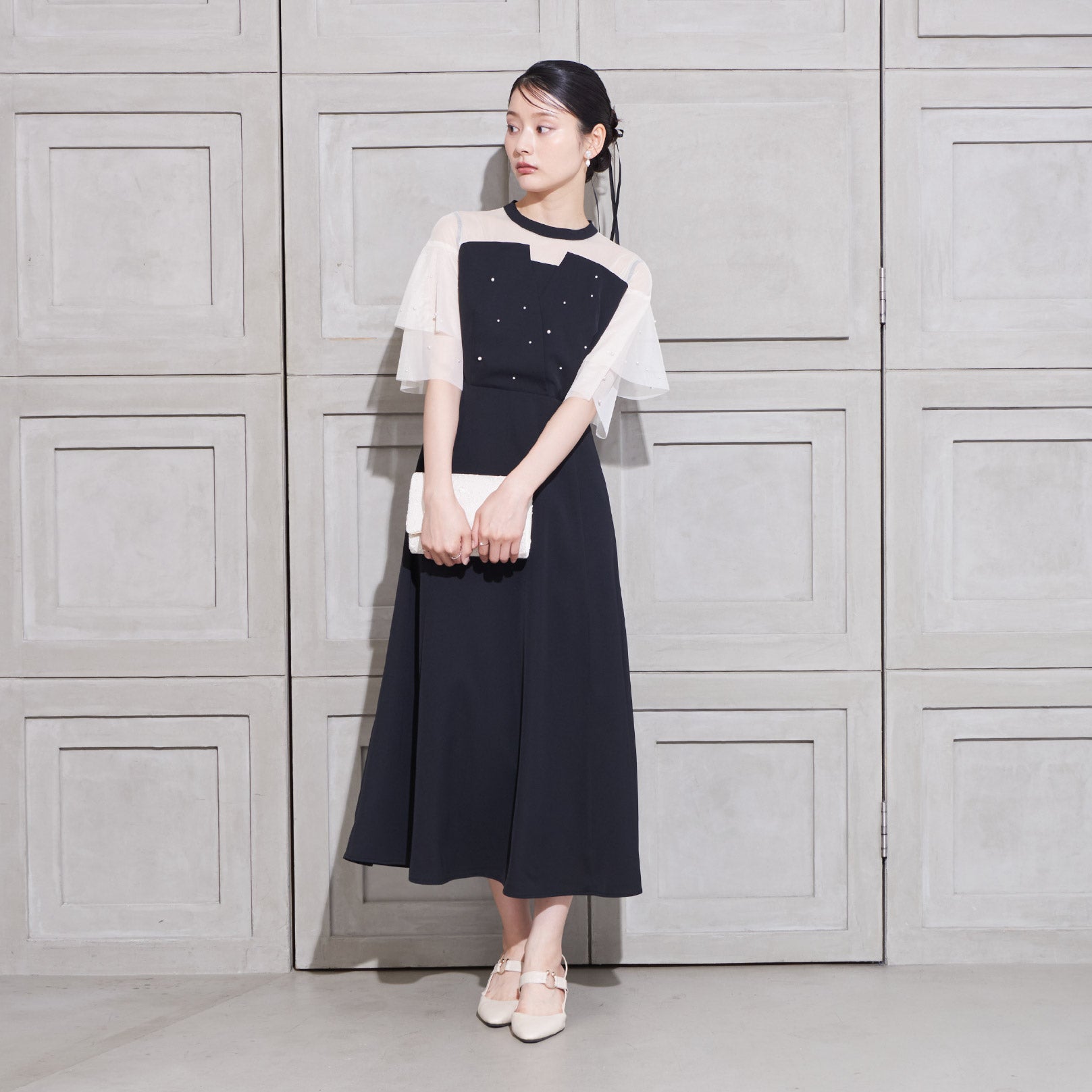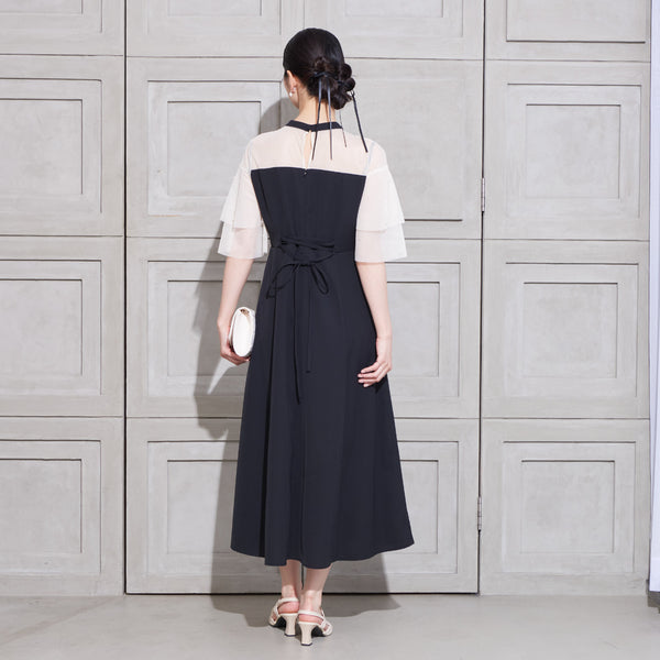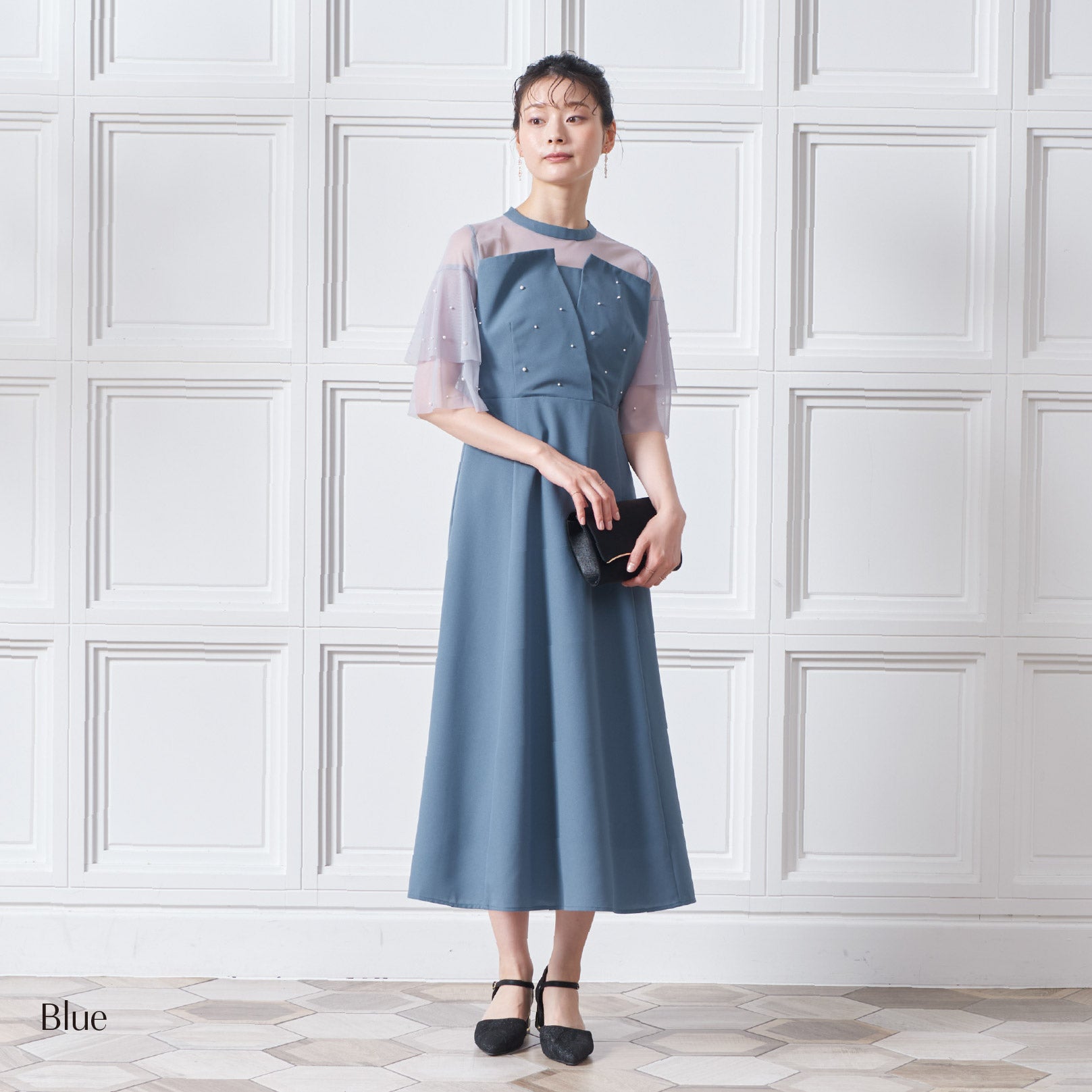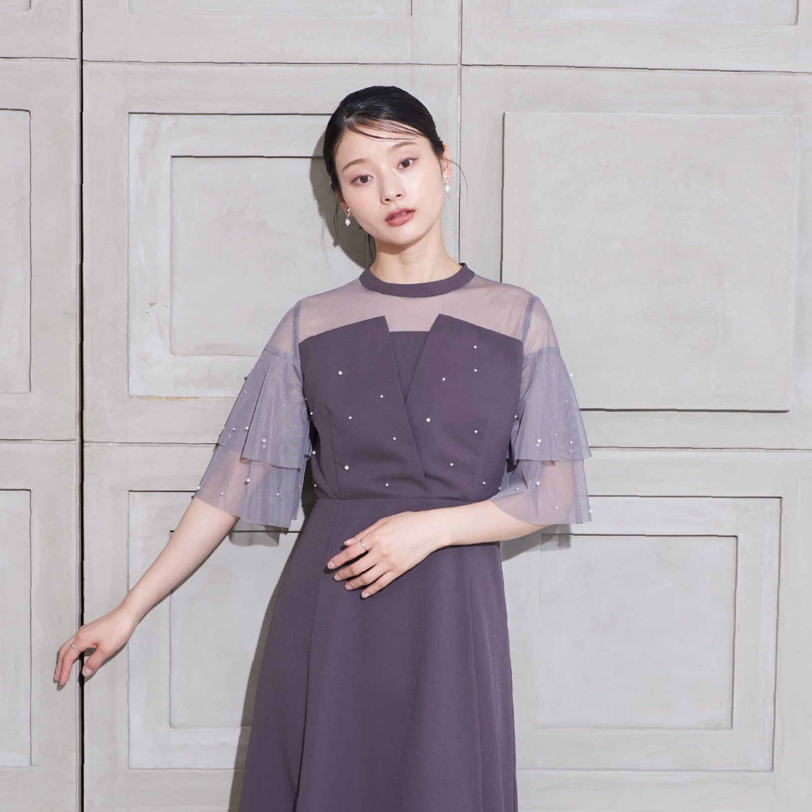 繊細なビジューを散りばめ、さりげない輝きを添えた上品なドレス。透明感のあるシアー素材を使用したヨーク部分とフリルスリーブが、軽やかでフェミニンな印象を演出します。程よく広がるAラインシルエットで、体型を美しく見せながら動きやすさも兼ね備えた一枚です。