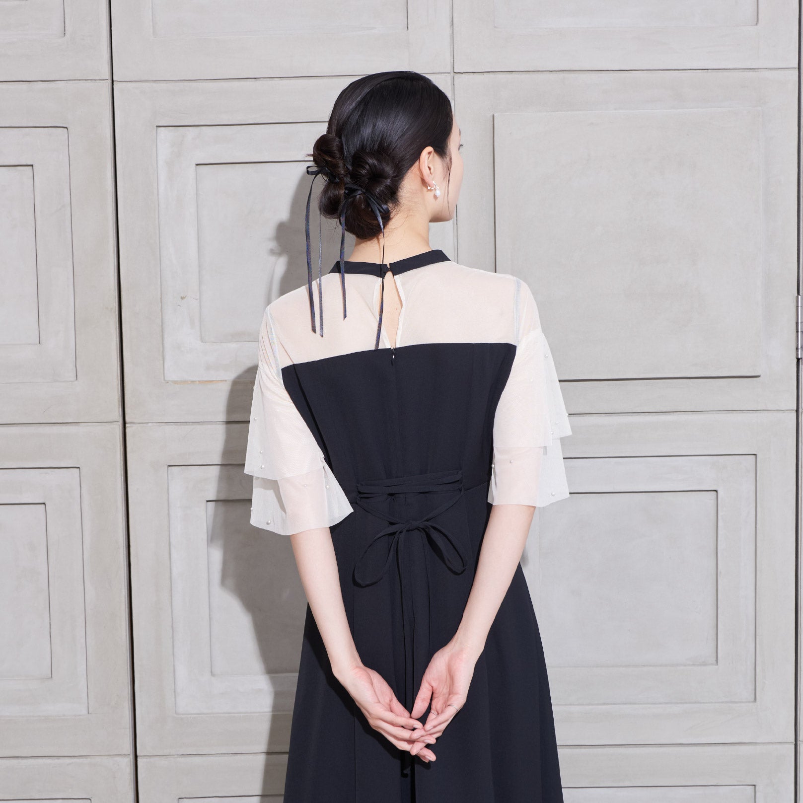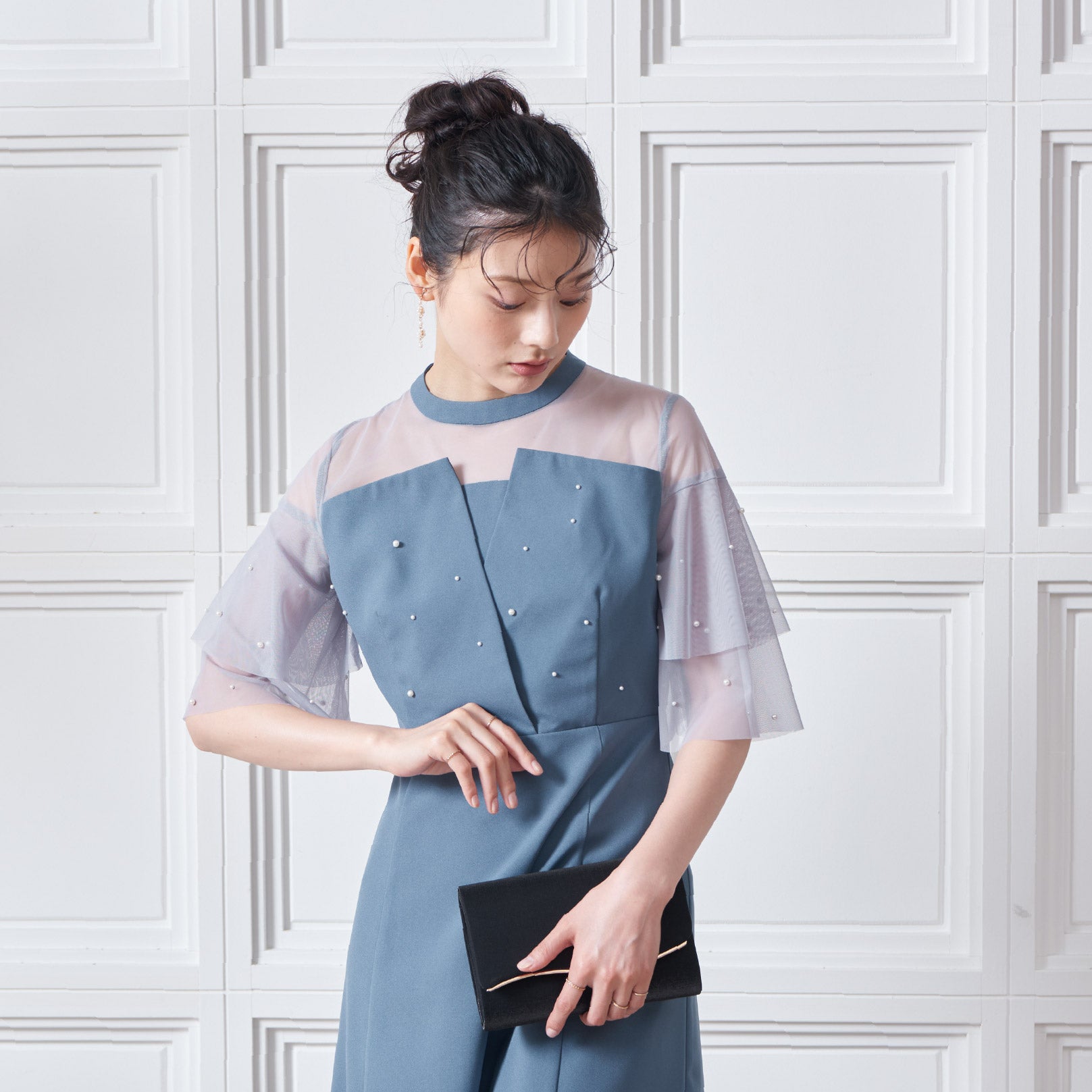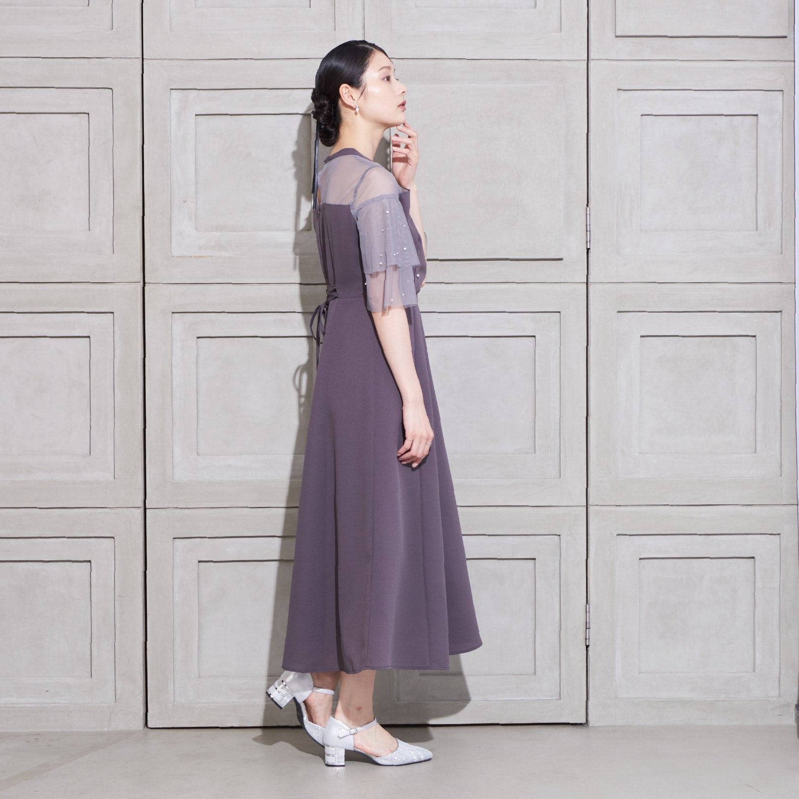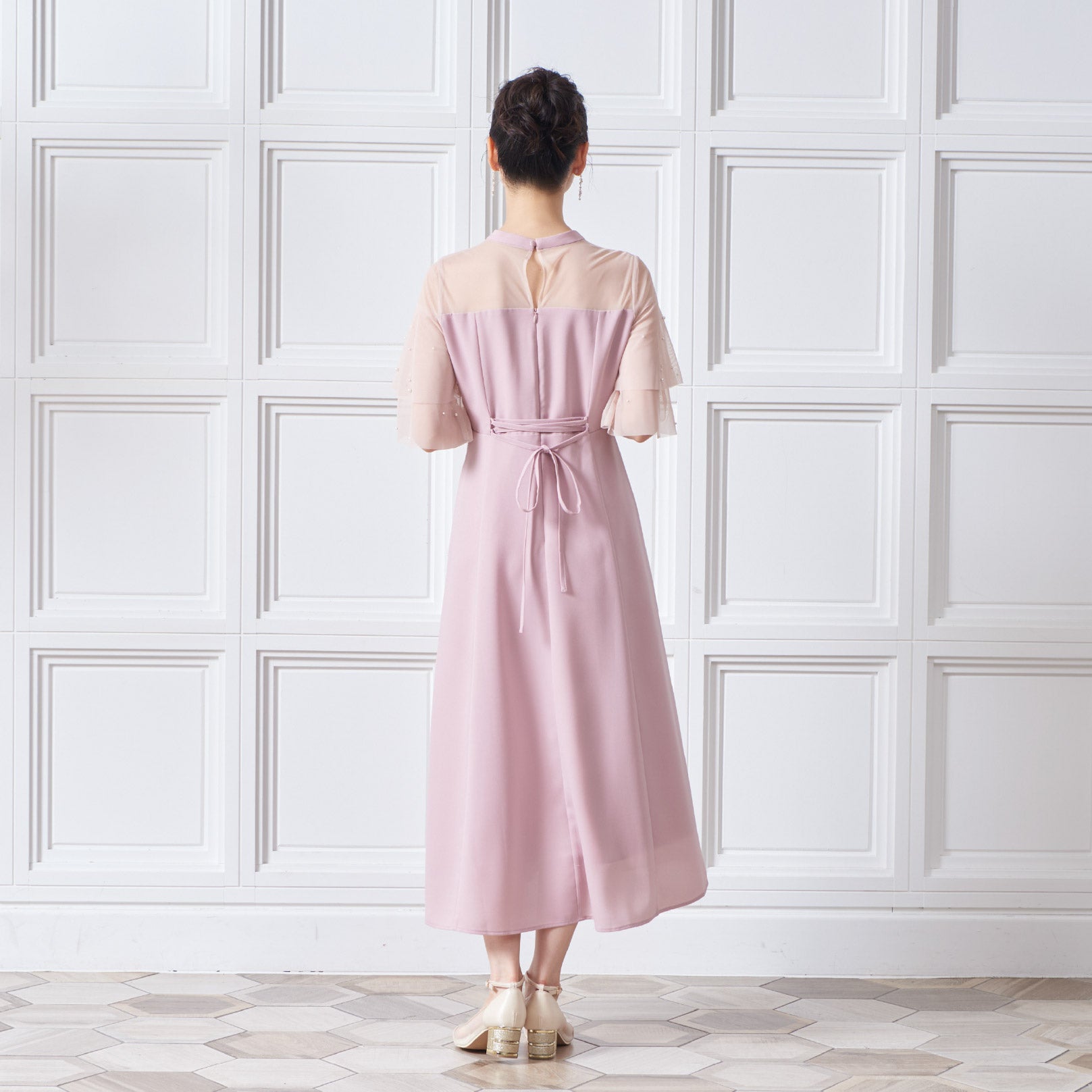 繊細なビジューを散りばめ、さりげない輝きを添えた上品なドレス。透明感のあるシアー素材を使用したヨーク部分とフリルスリーブが、軽やかでフェミニンな印象を演出します。程よく広がるAラインシルエットで、体型を美しく見せながら動きやすさも兼ね備えた一枚です。