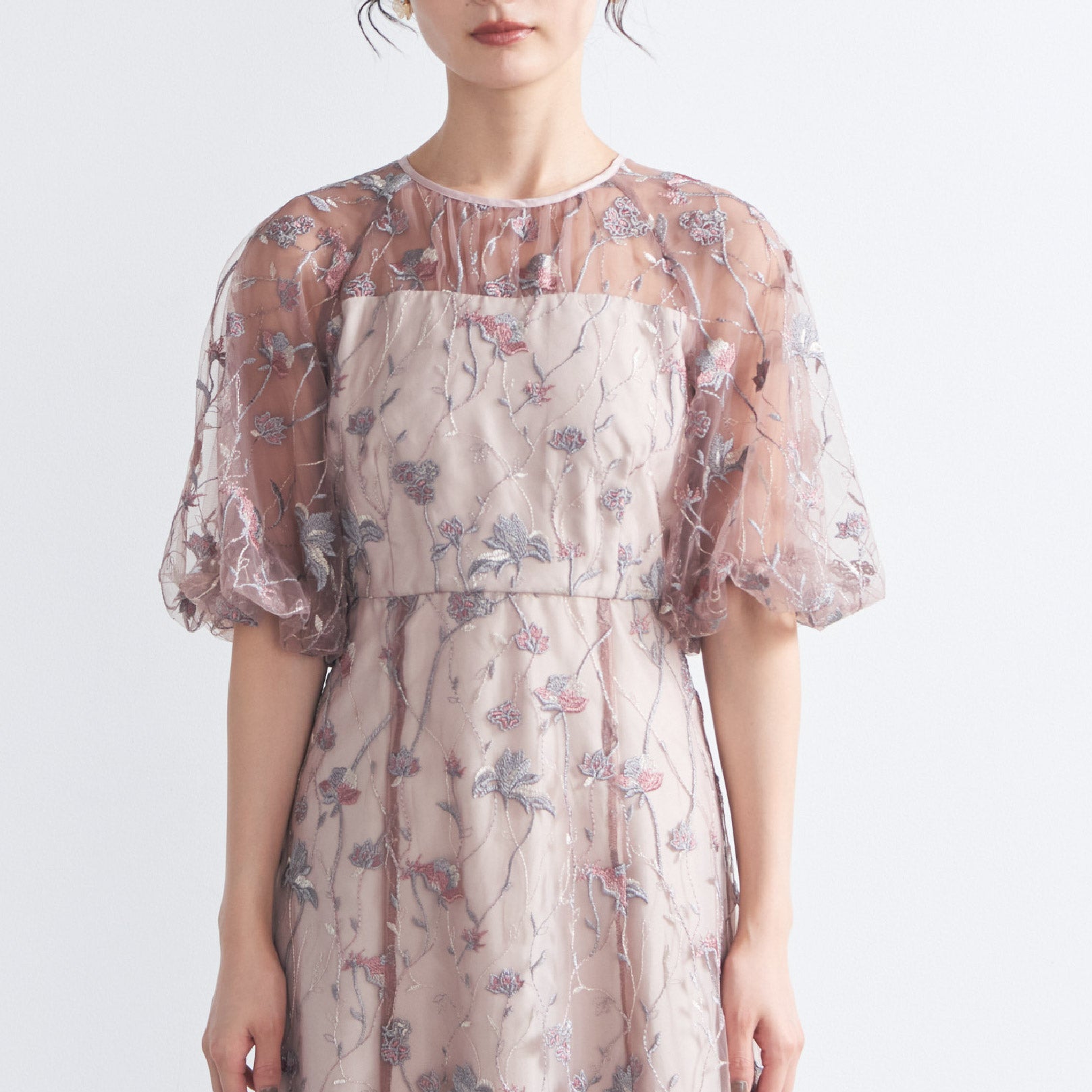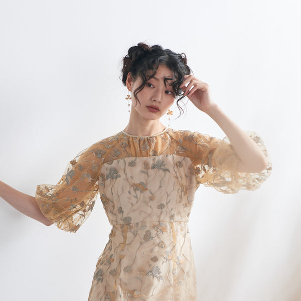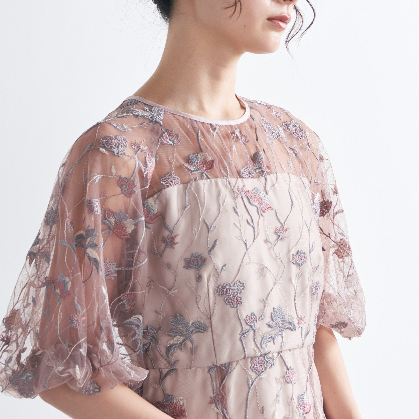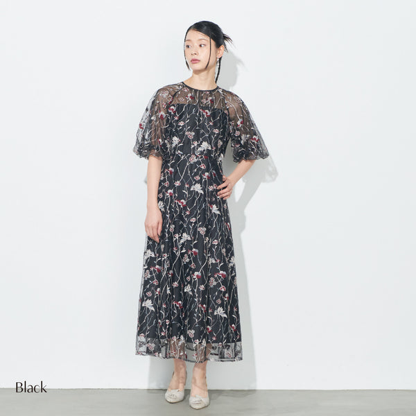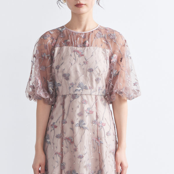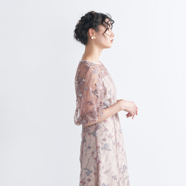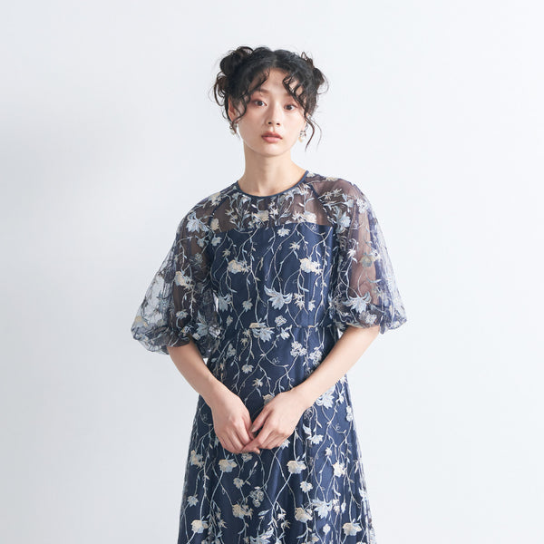 チュールにオリジナルカラーの繊細な刺繍をあしらったシアーで華やかなドレスです。