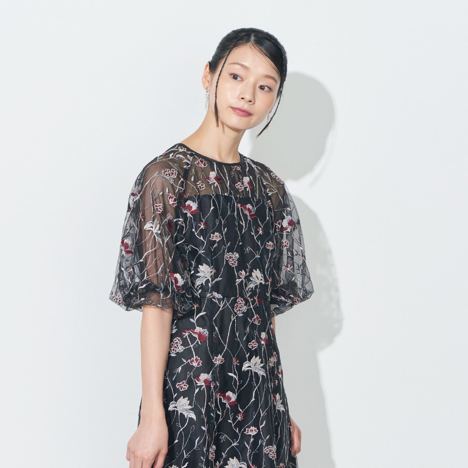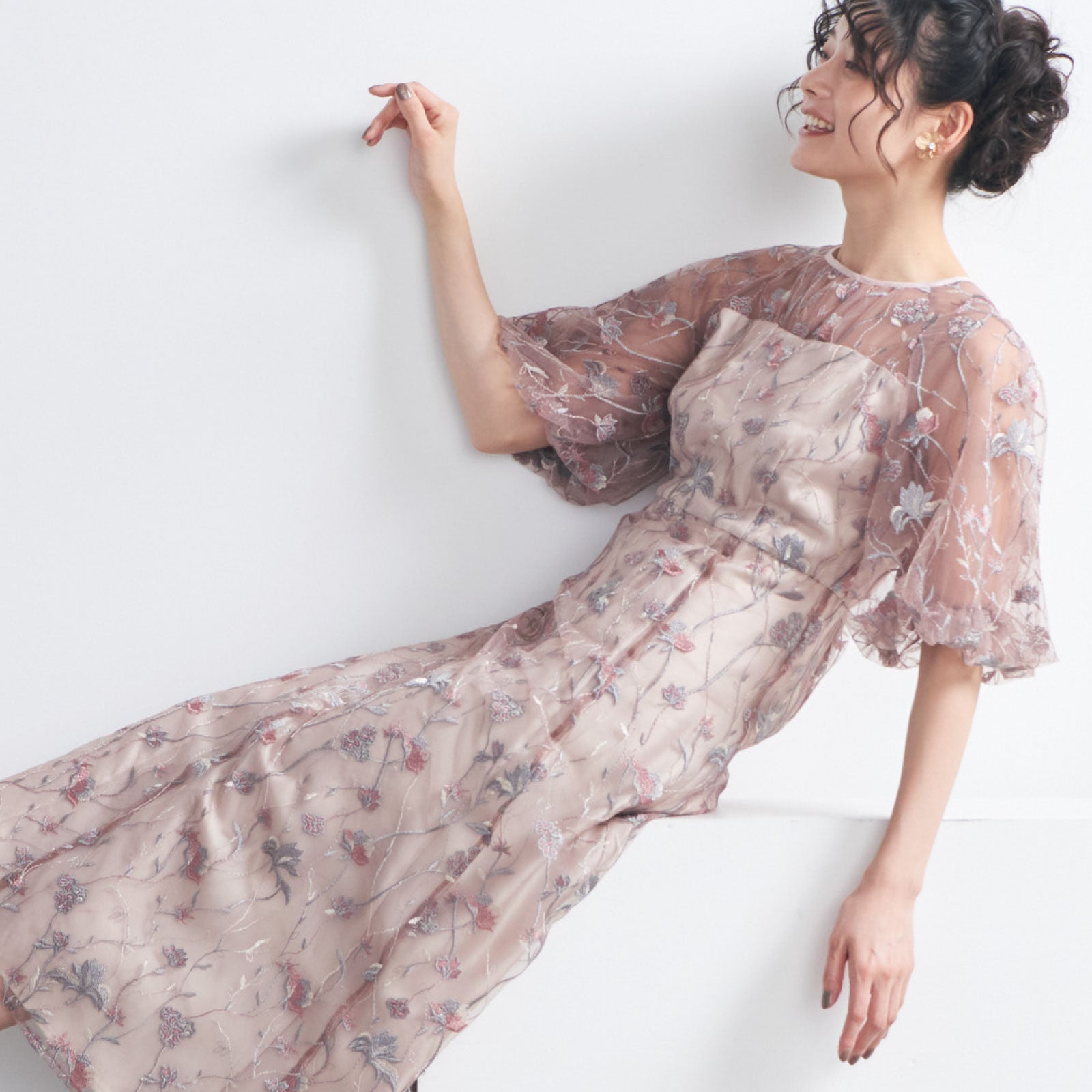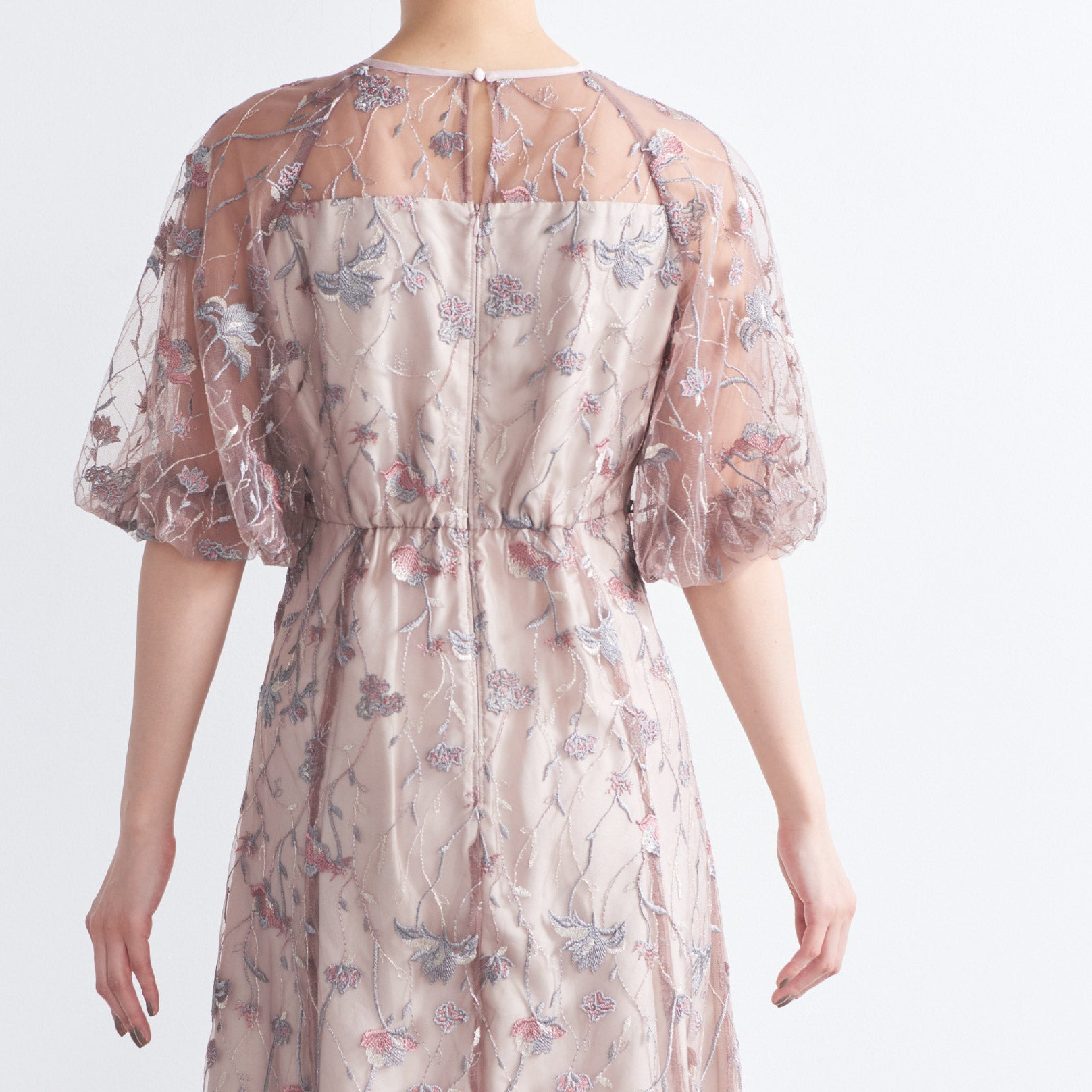 チュールにオリジナルカラーの繊細な刺繍をあしらったシアーで華やかなドレスです。