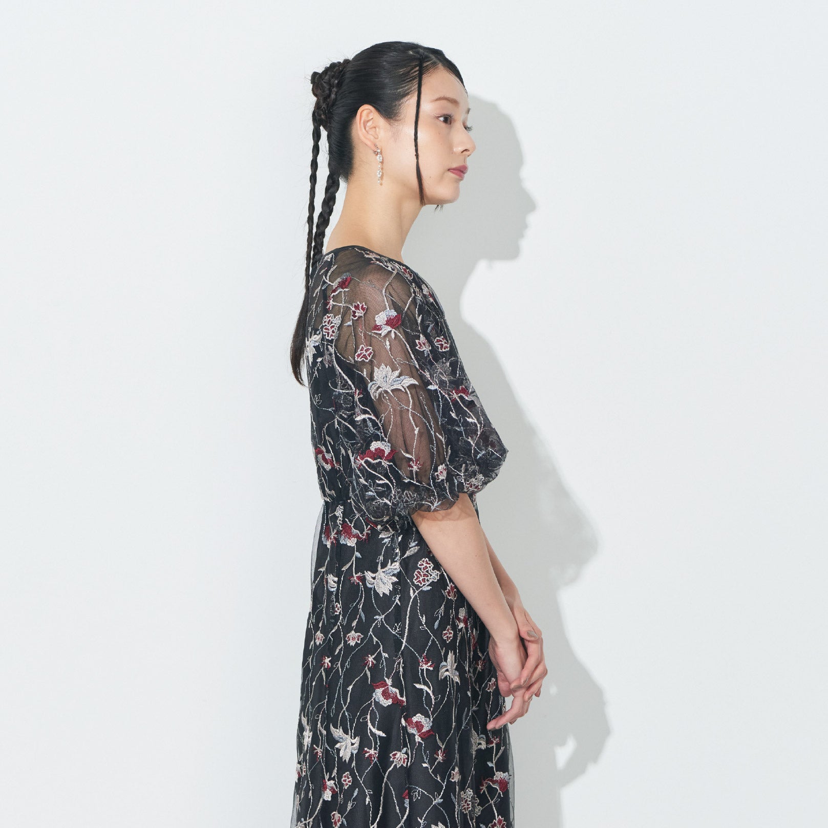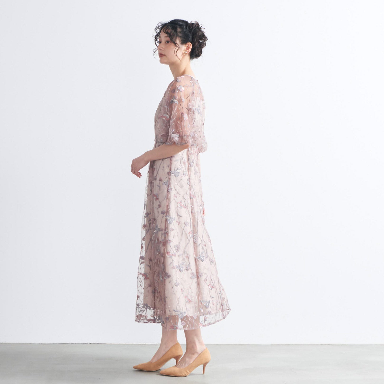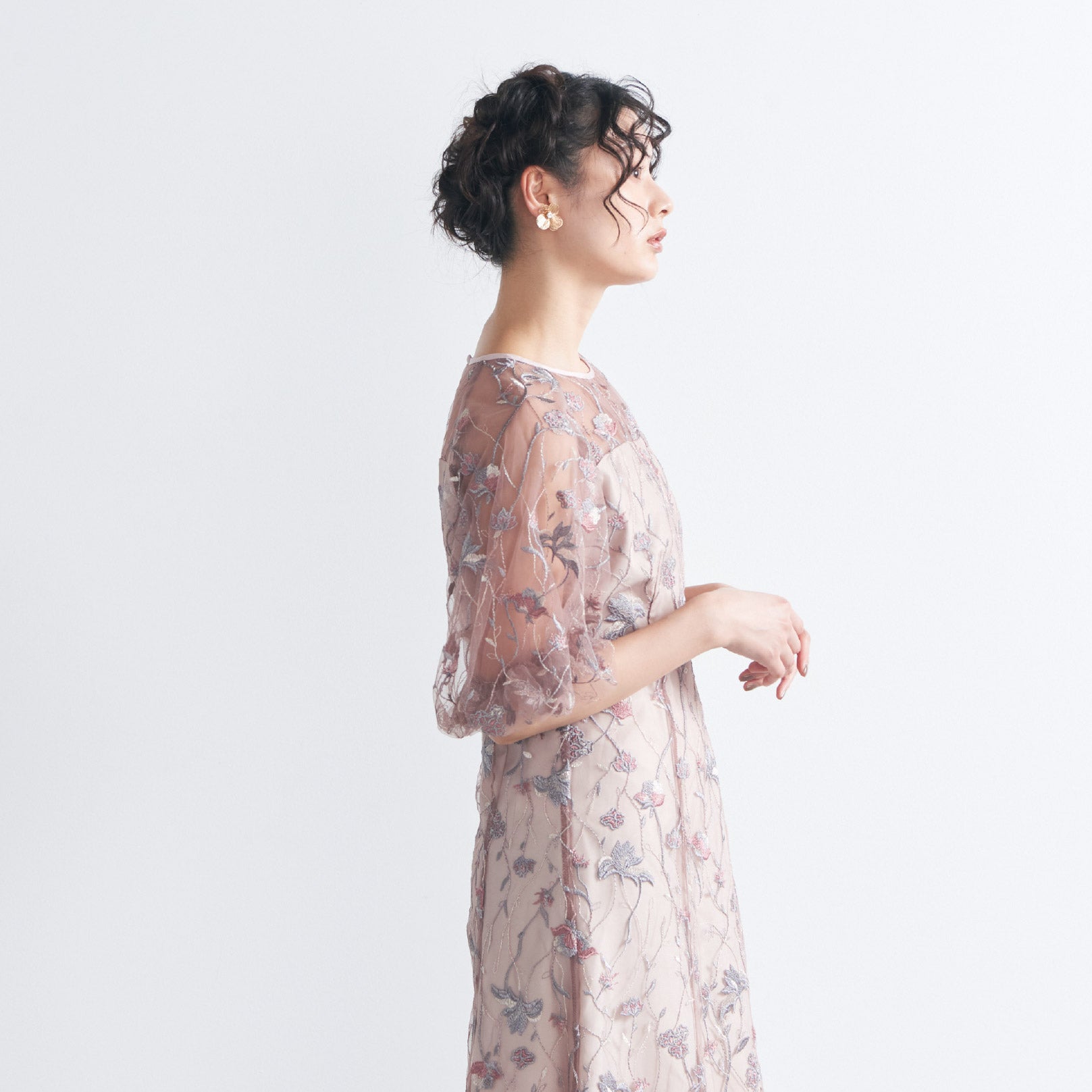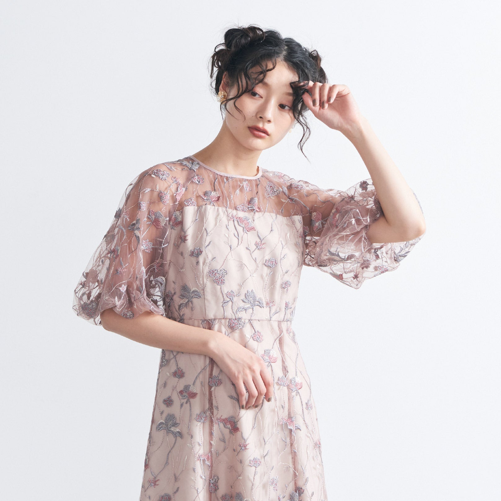 チュールにオリジナルカラーの繊細な刺繍をあしらったシアーで華やかなドレスです。