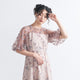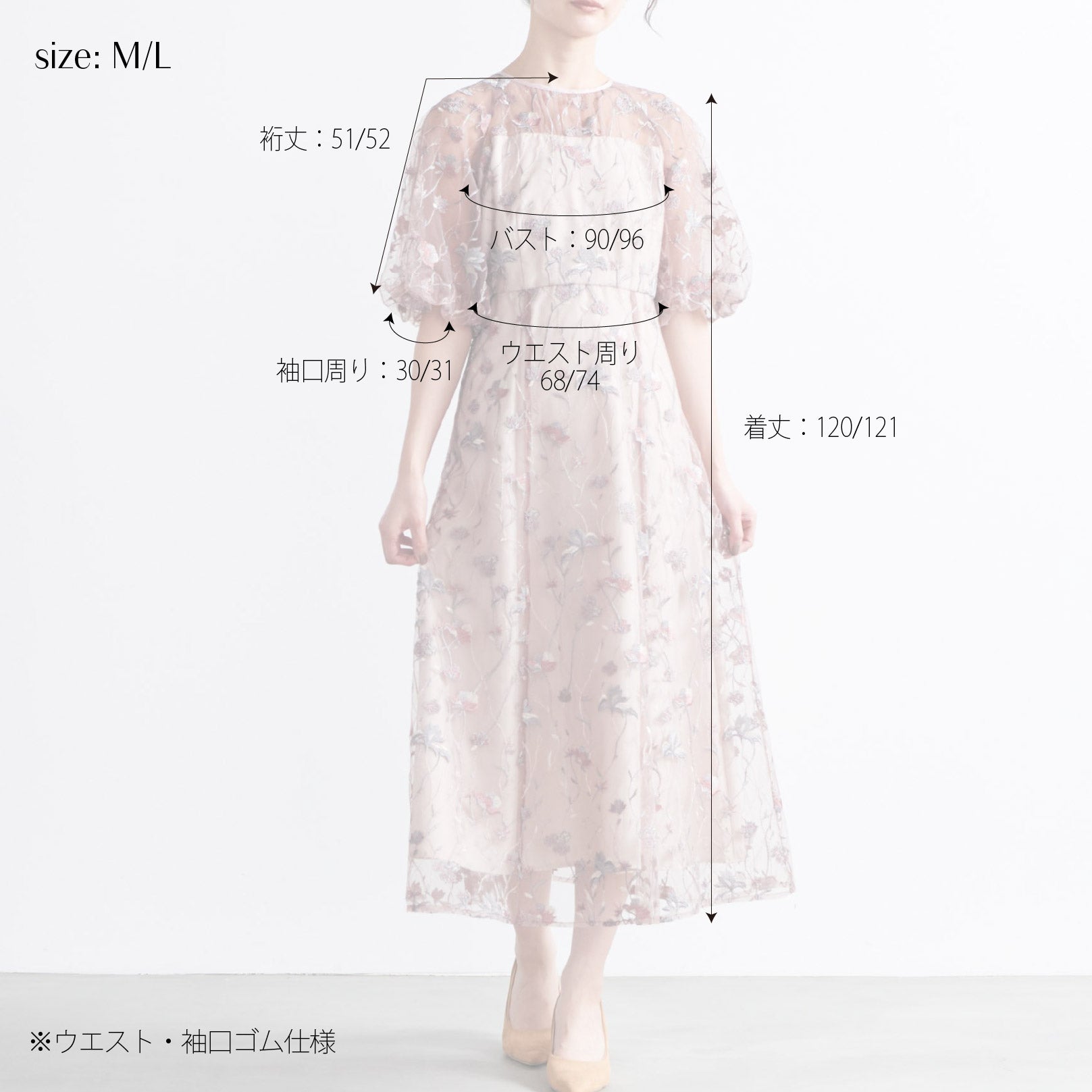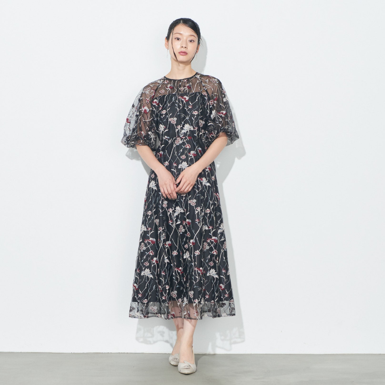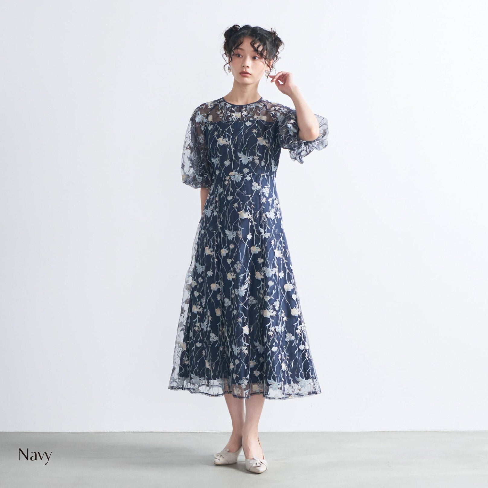 ふんわりとしたパフスリーブが肩まわりに優しいボリュームを添え、女性らしい柔らかさを演出します。