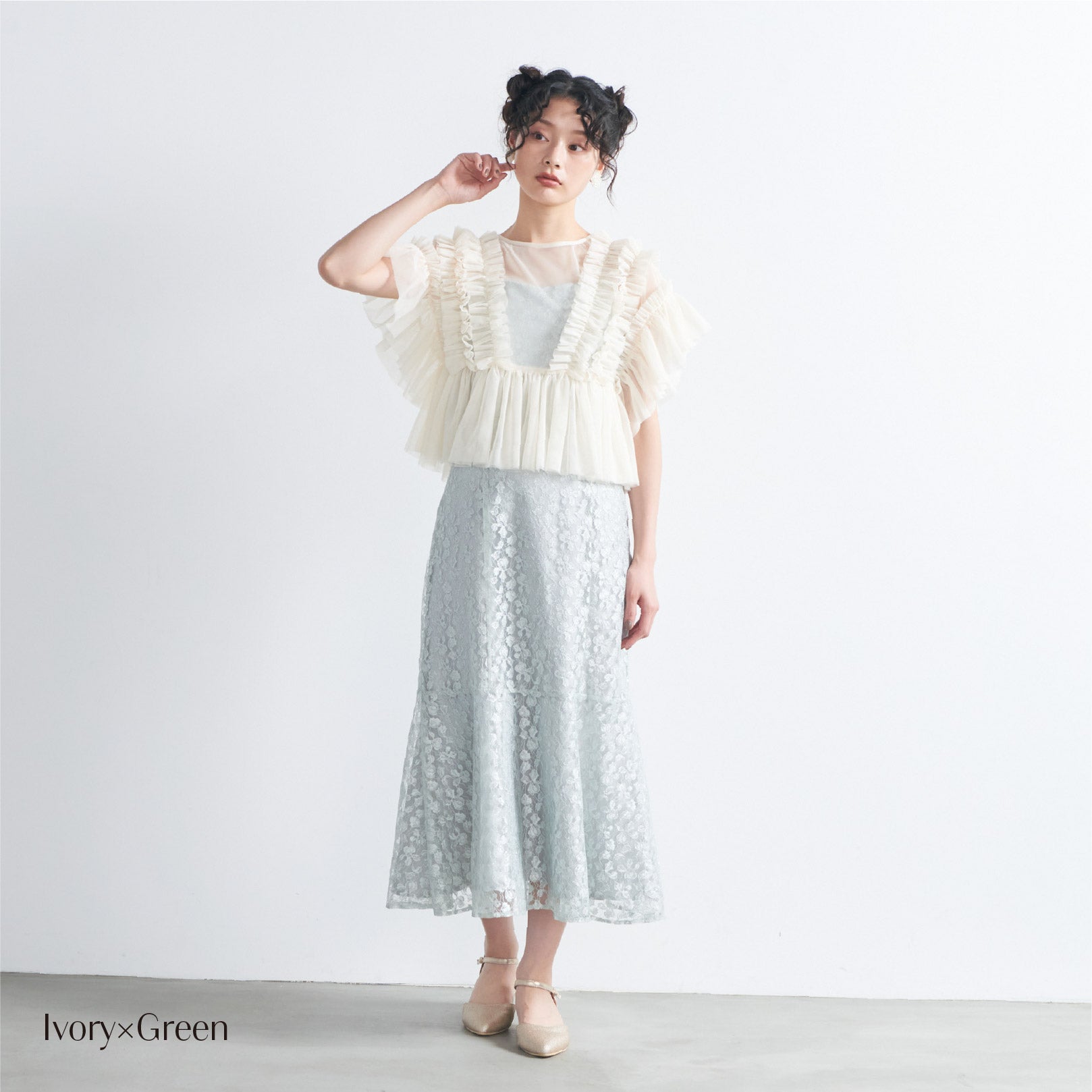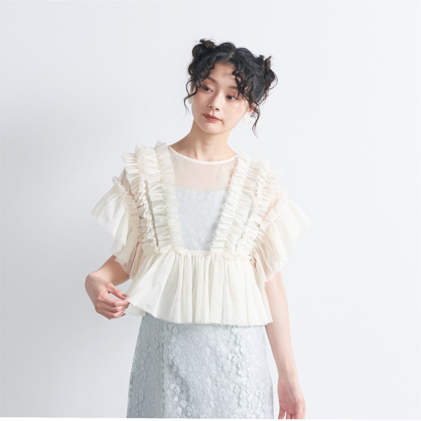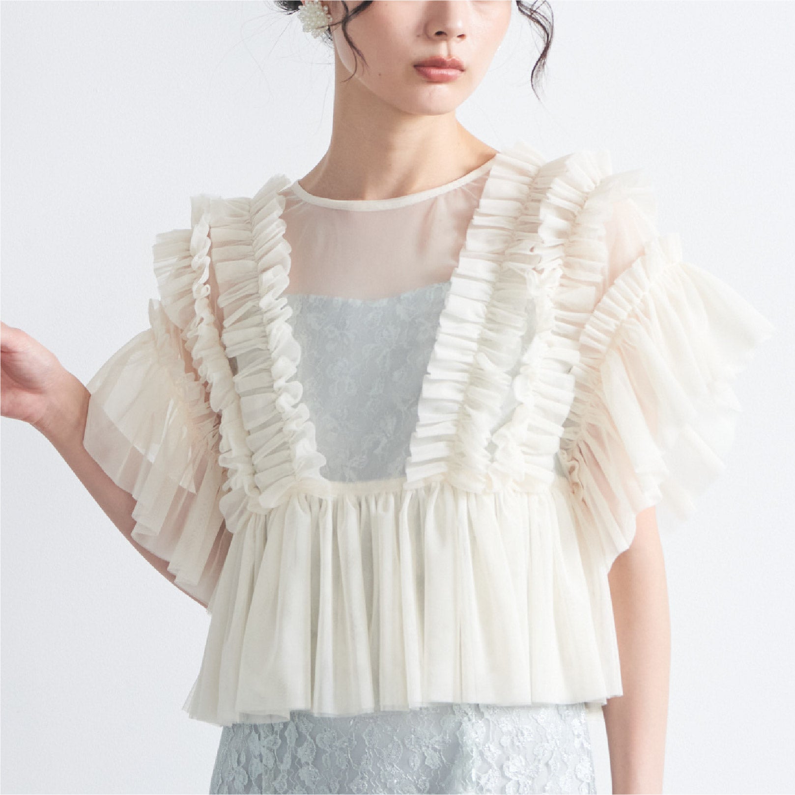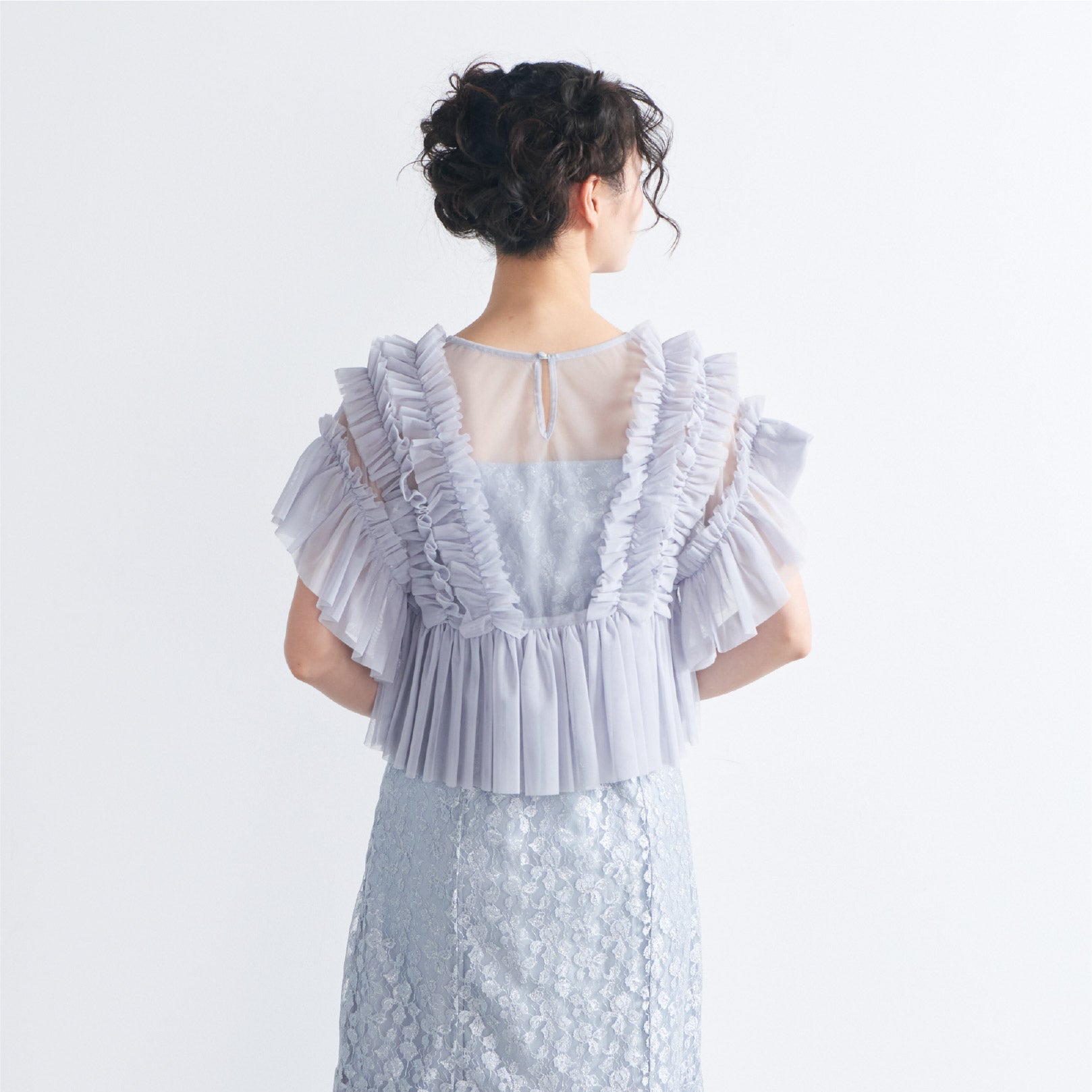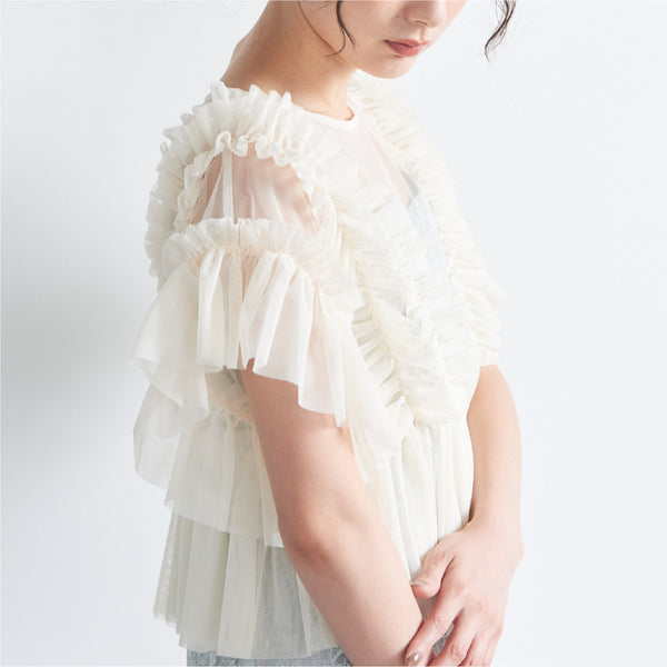 トップスは立体的なフリルをたっぷりとあしらい、華やかで存在感のあるデザインに仕上げました。
