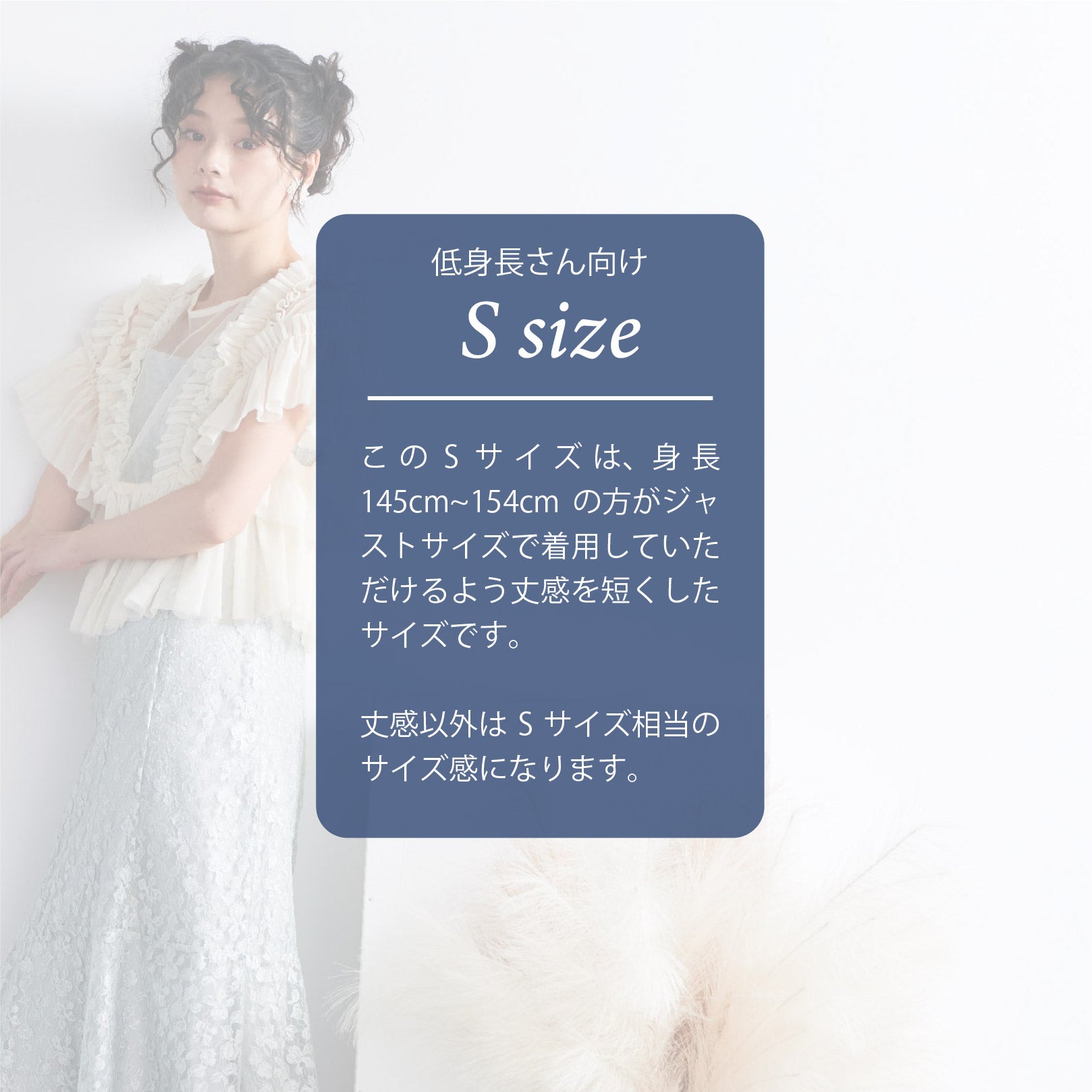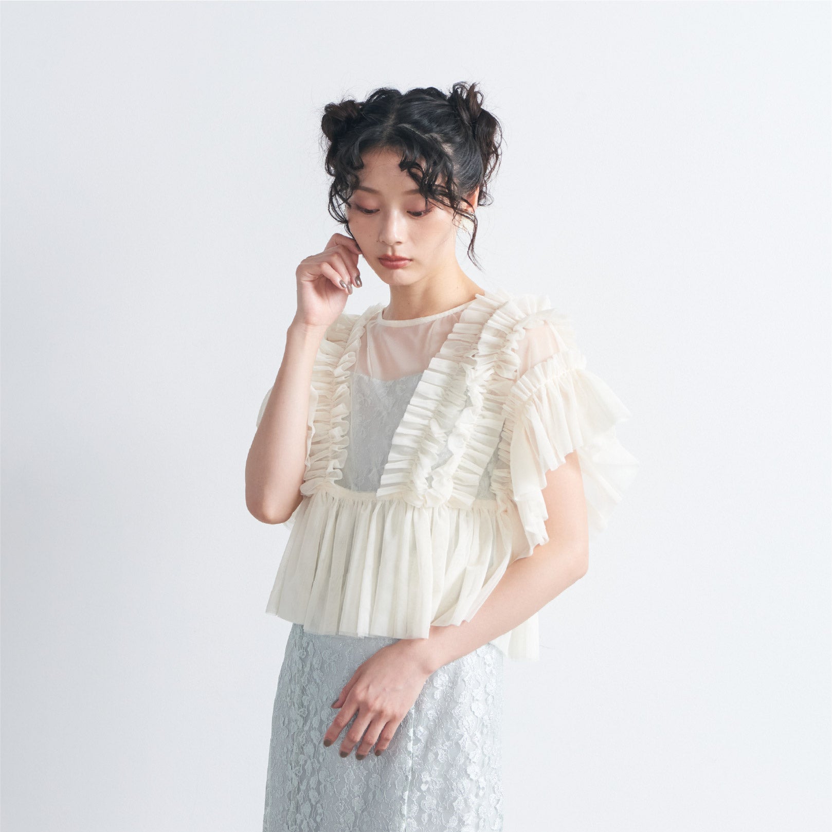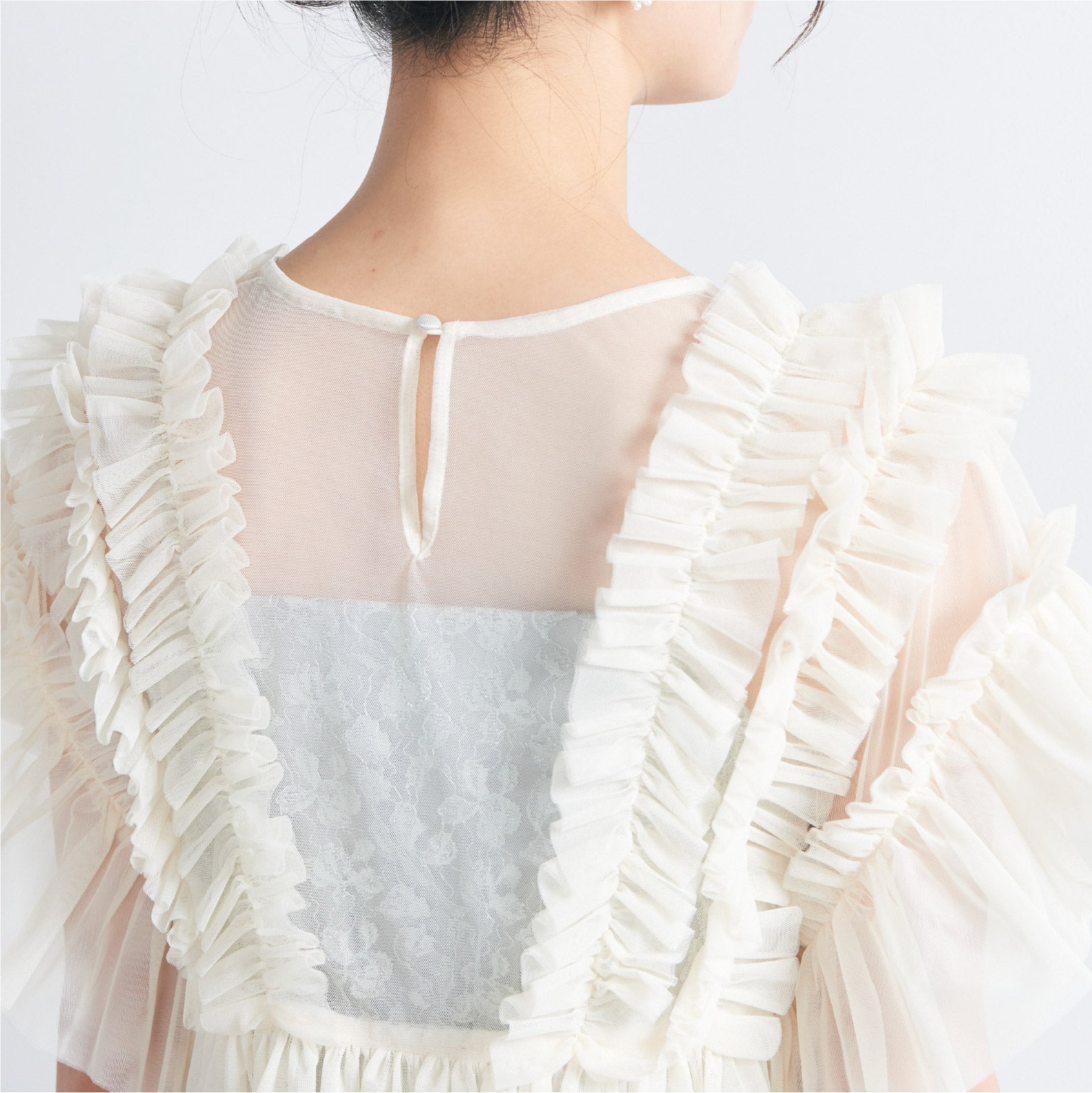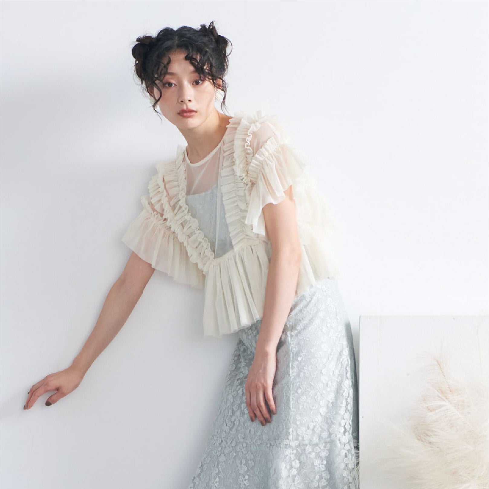 トップスは立体的なフリルをたっぷりとあしらい、華やかで存在感のあるデザインに仕上げました。