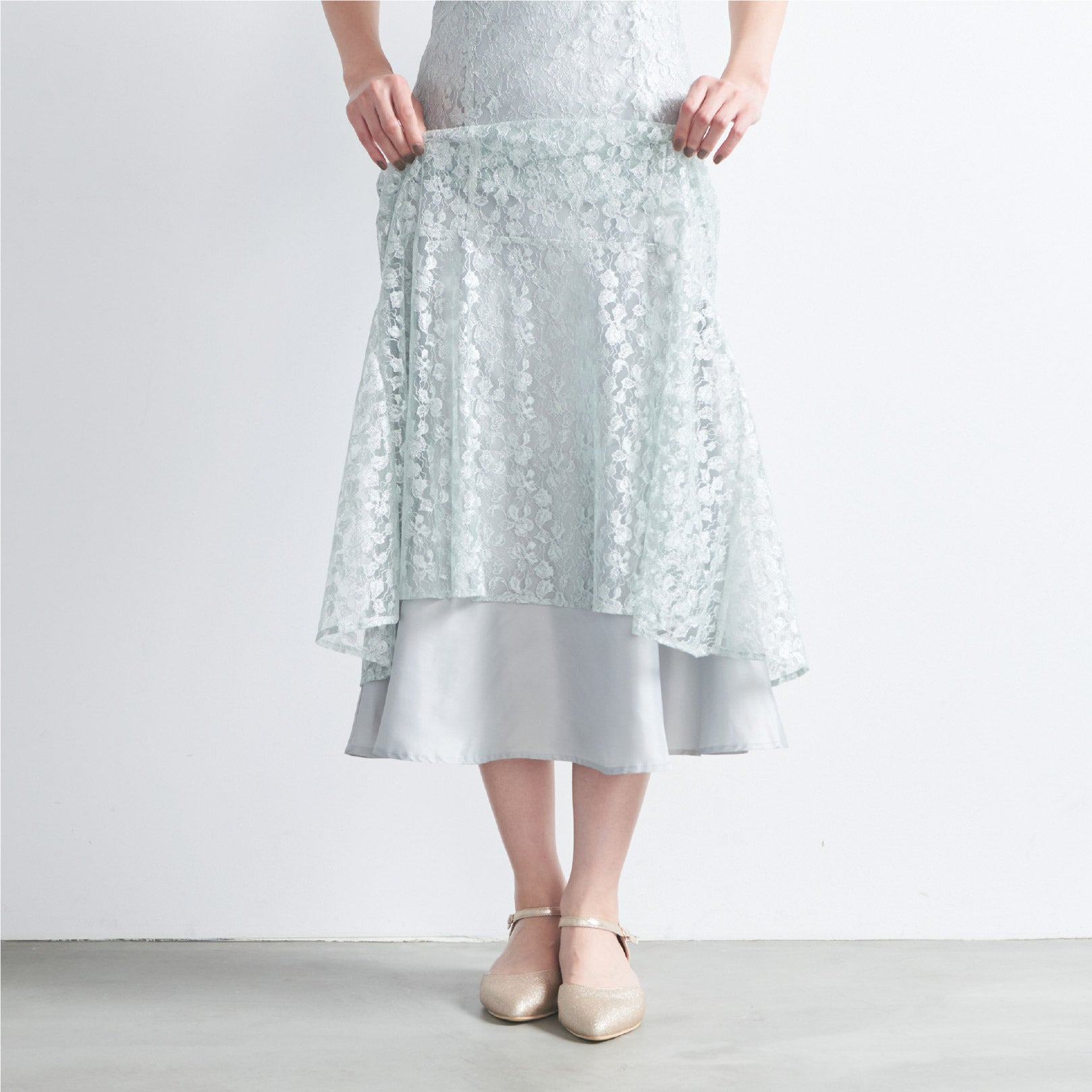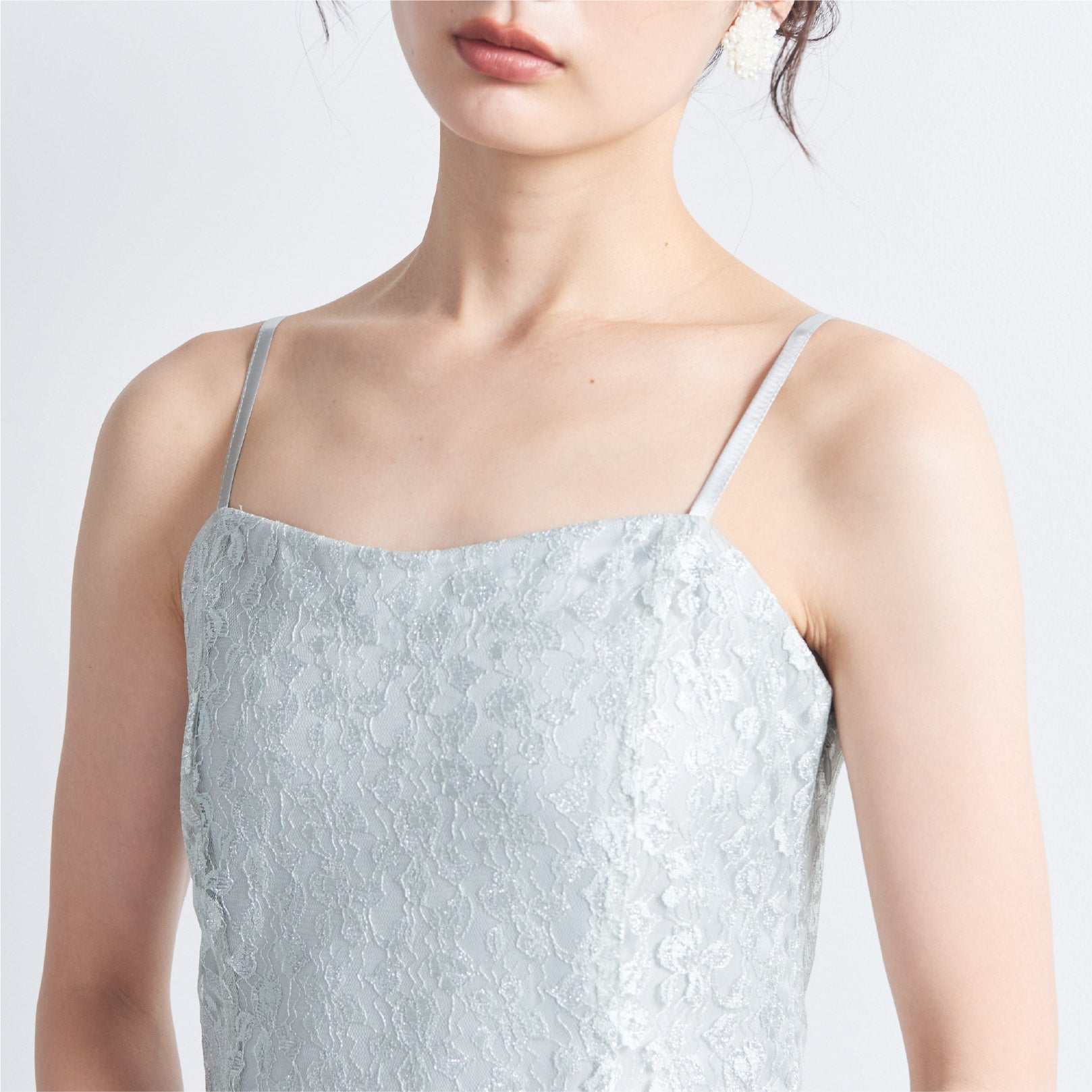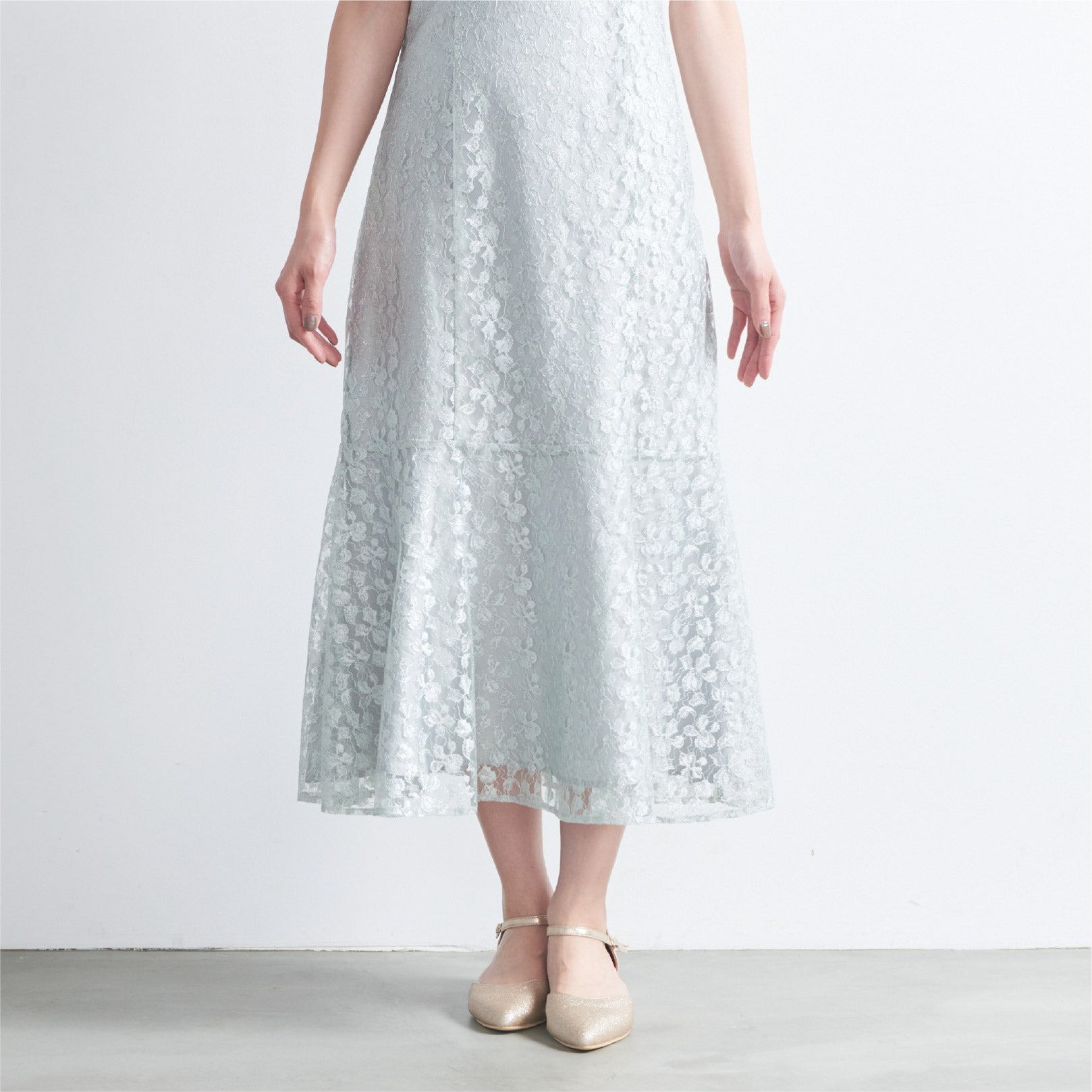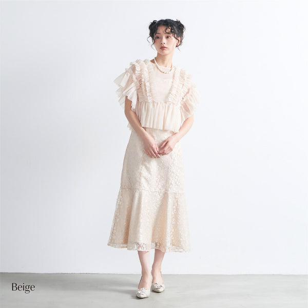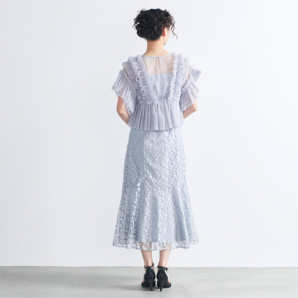 繊細なラメ付きレースとボリュームのあるチュールトップスを組み合わせでエレガントな印象。