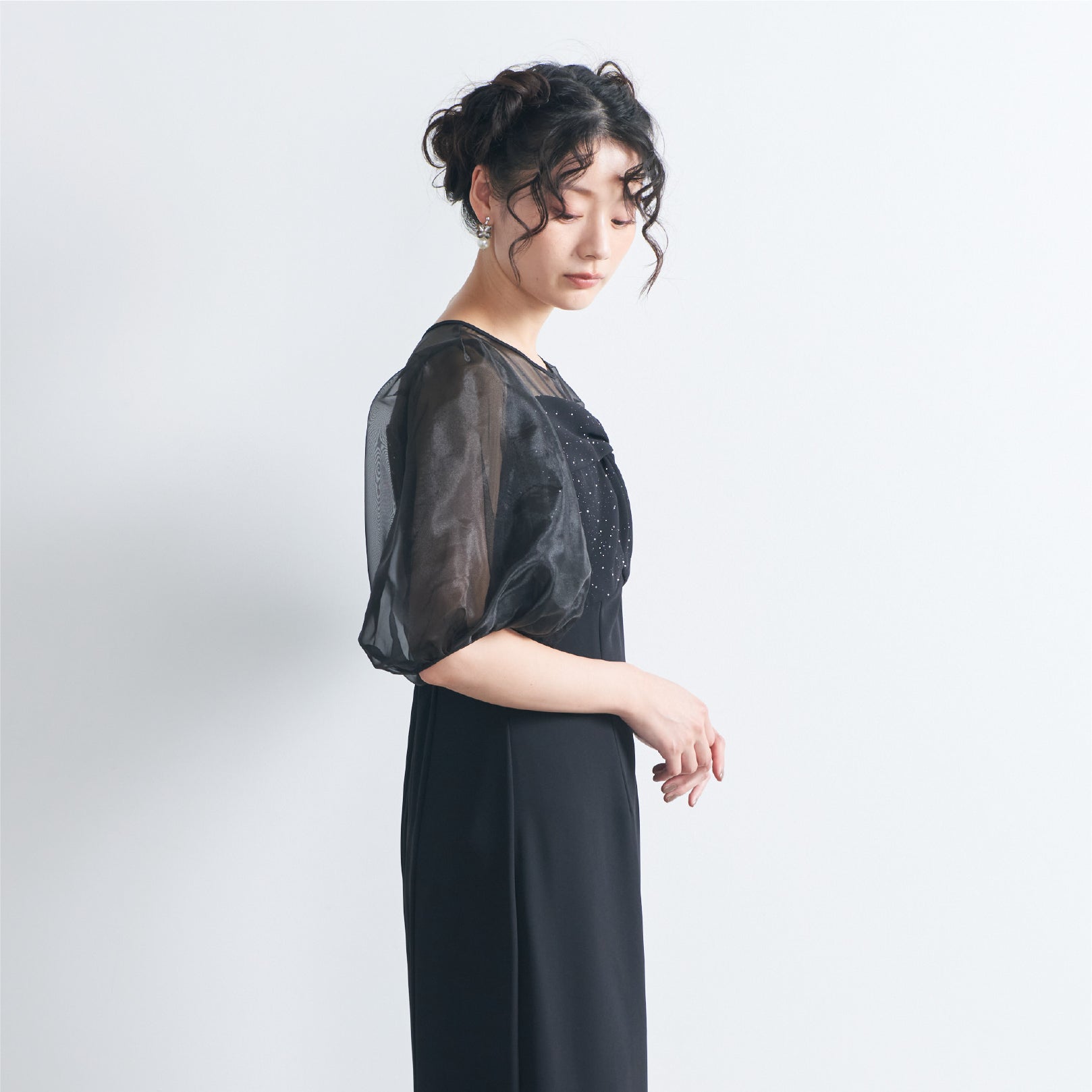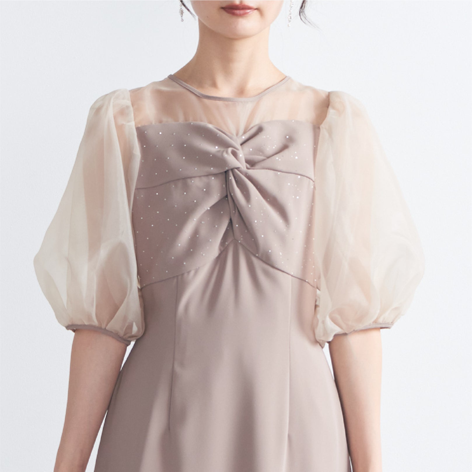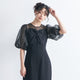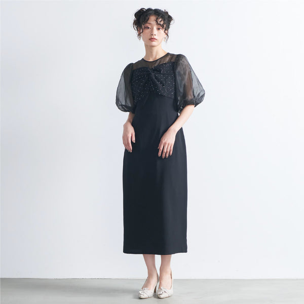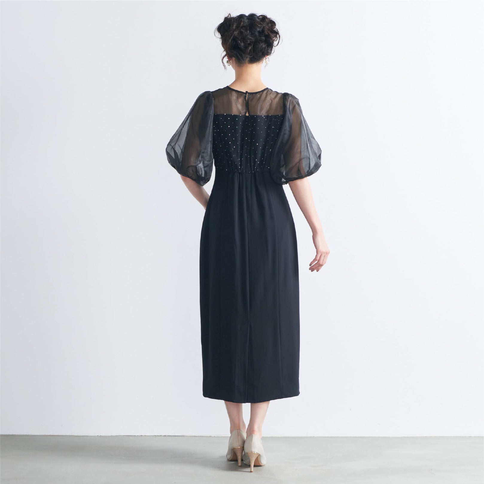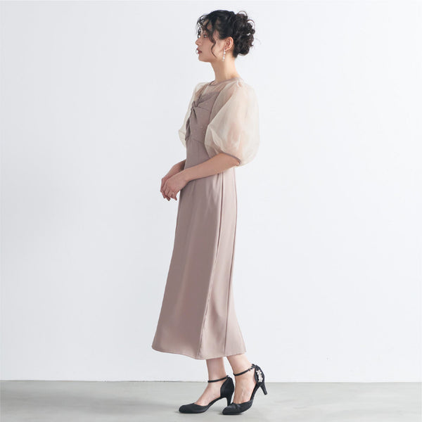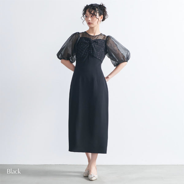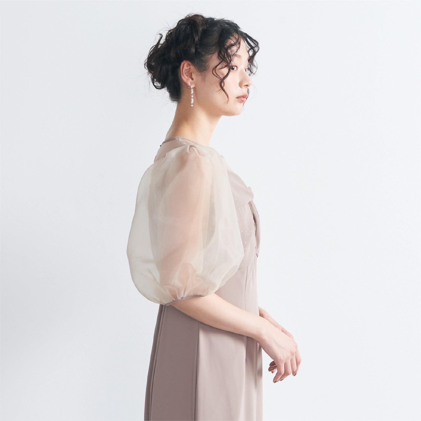 ふんわりとしたオーガンジーのパフスリーブと、胸元の華やかなデザインが印象的なIラインシルエットのドレスワンピース。