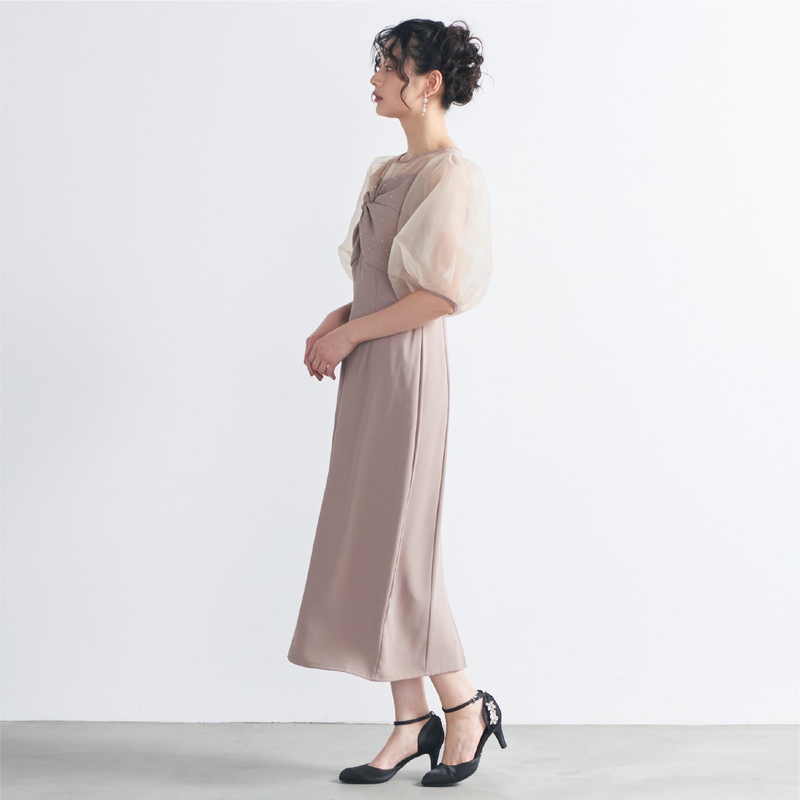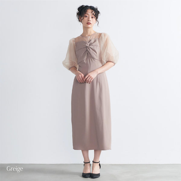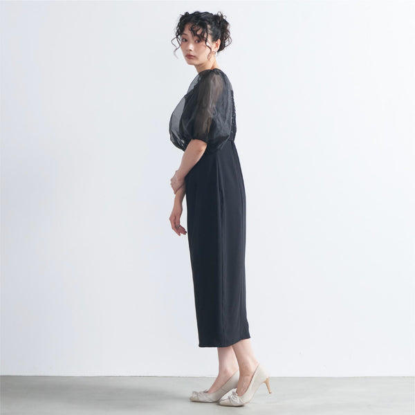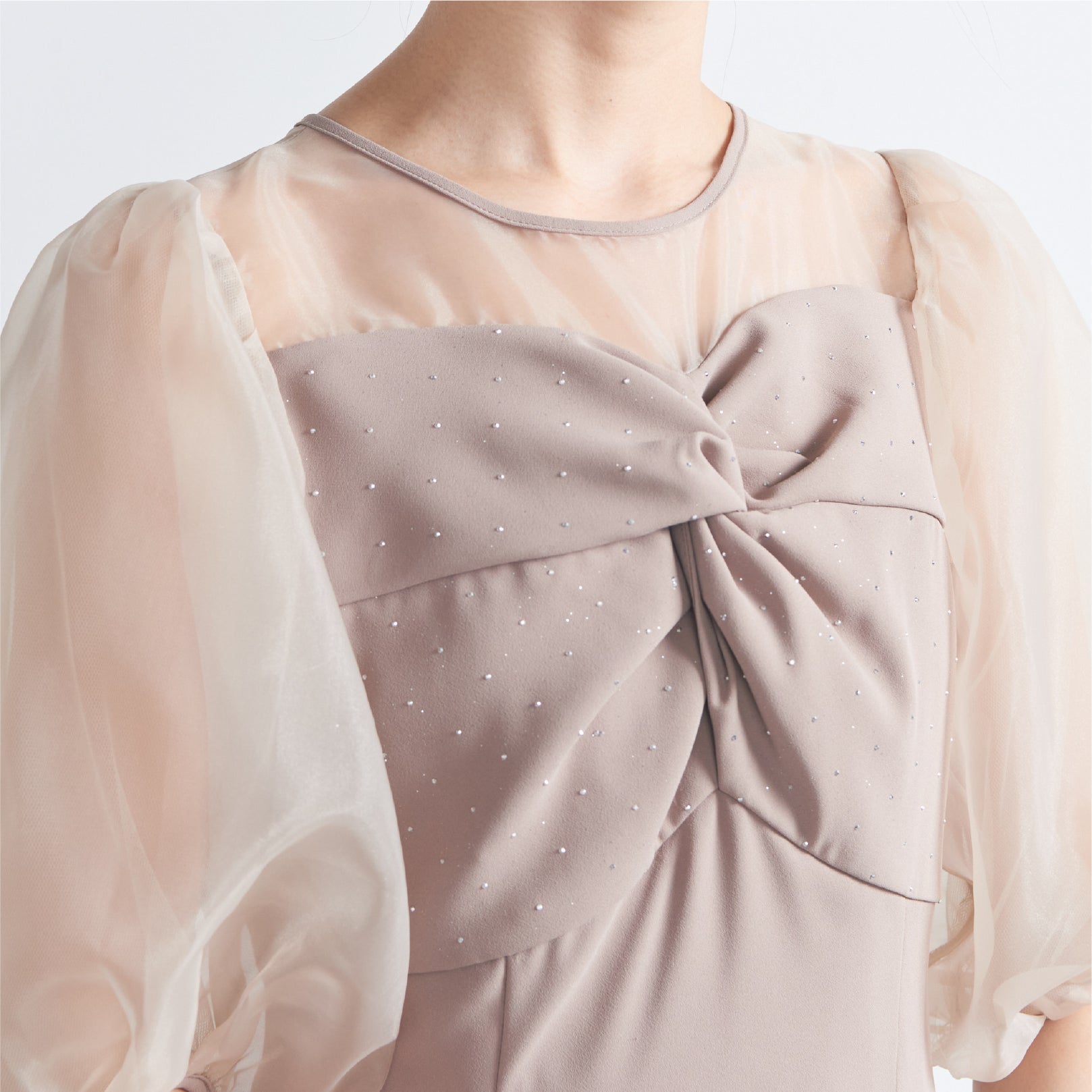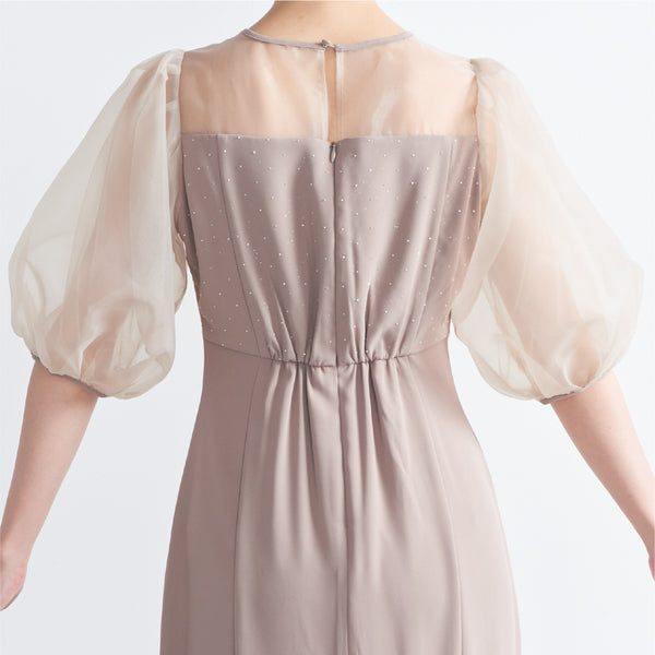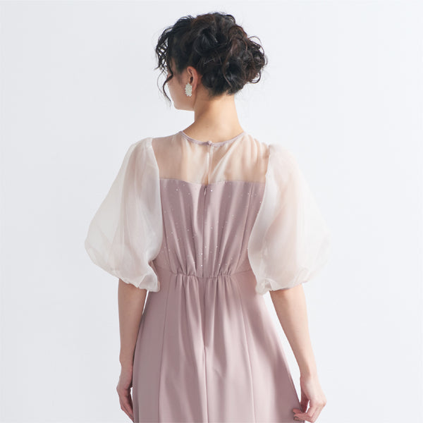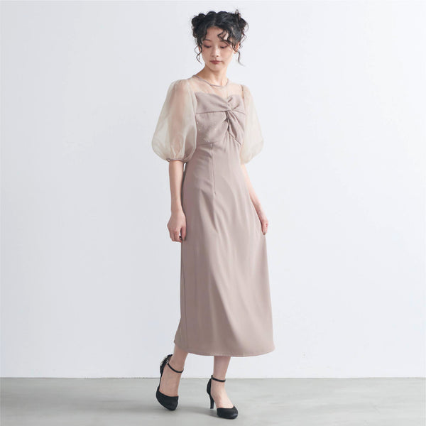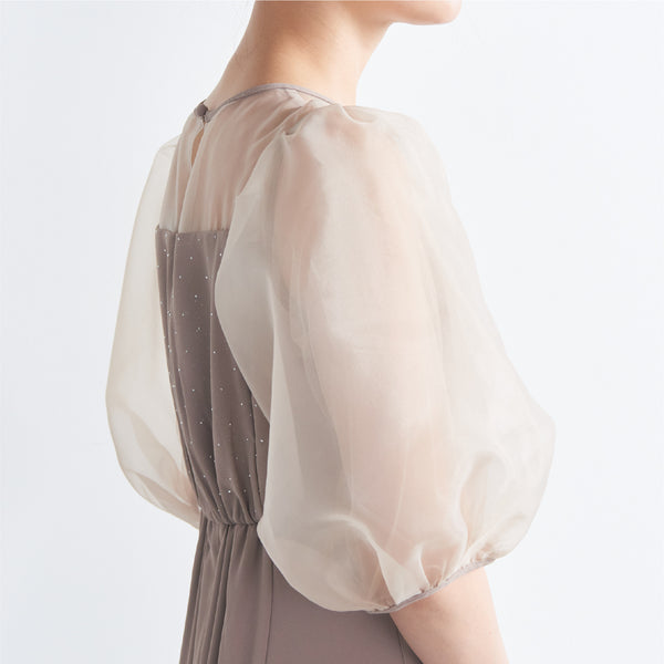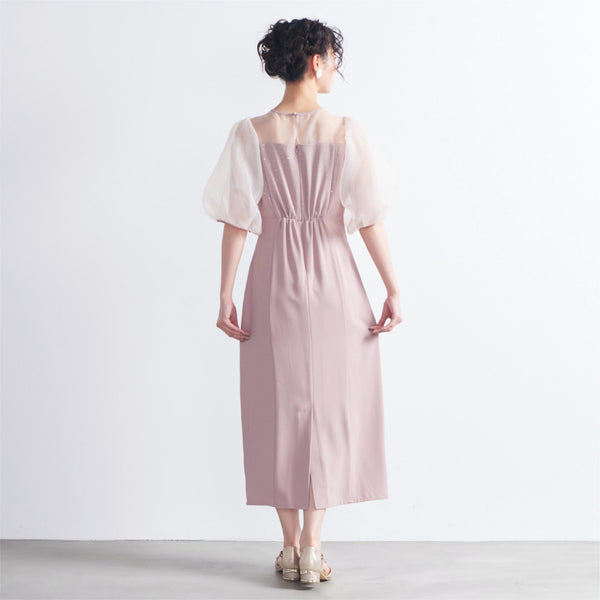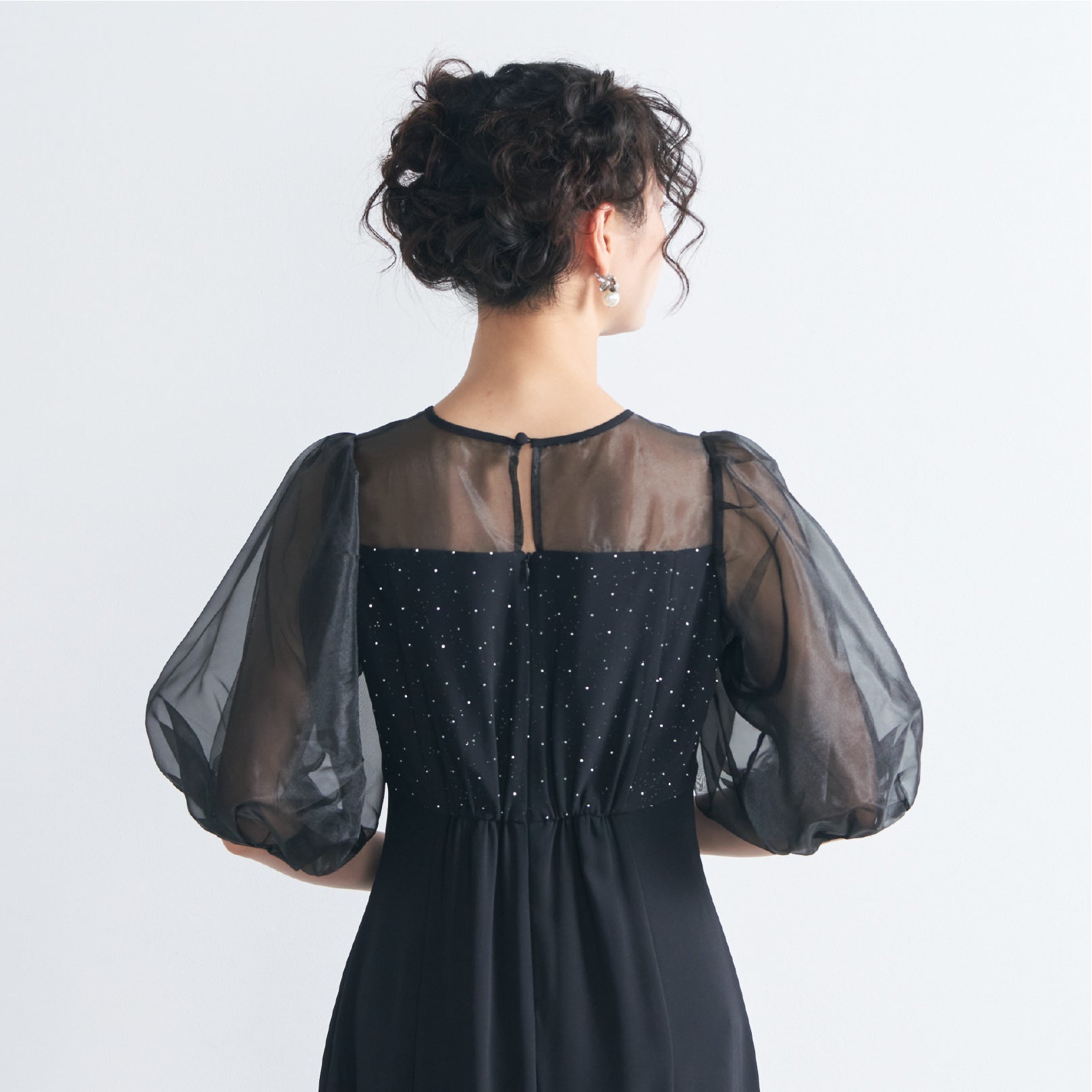 ふんわりとしたオーガンジーのパフスリーブと、胸元の華やかなデザインが印象的なIラインシルエットのドレスワンピース。
