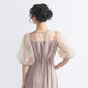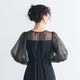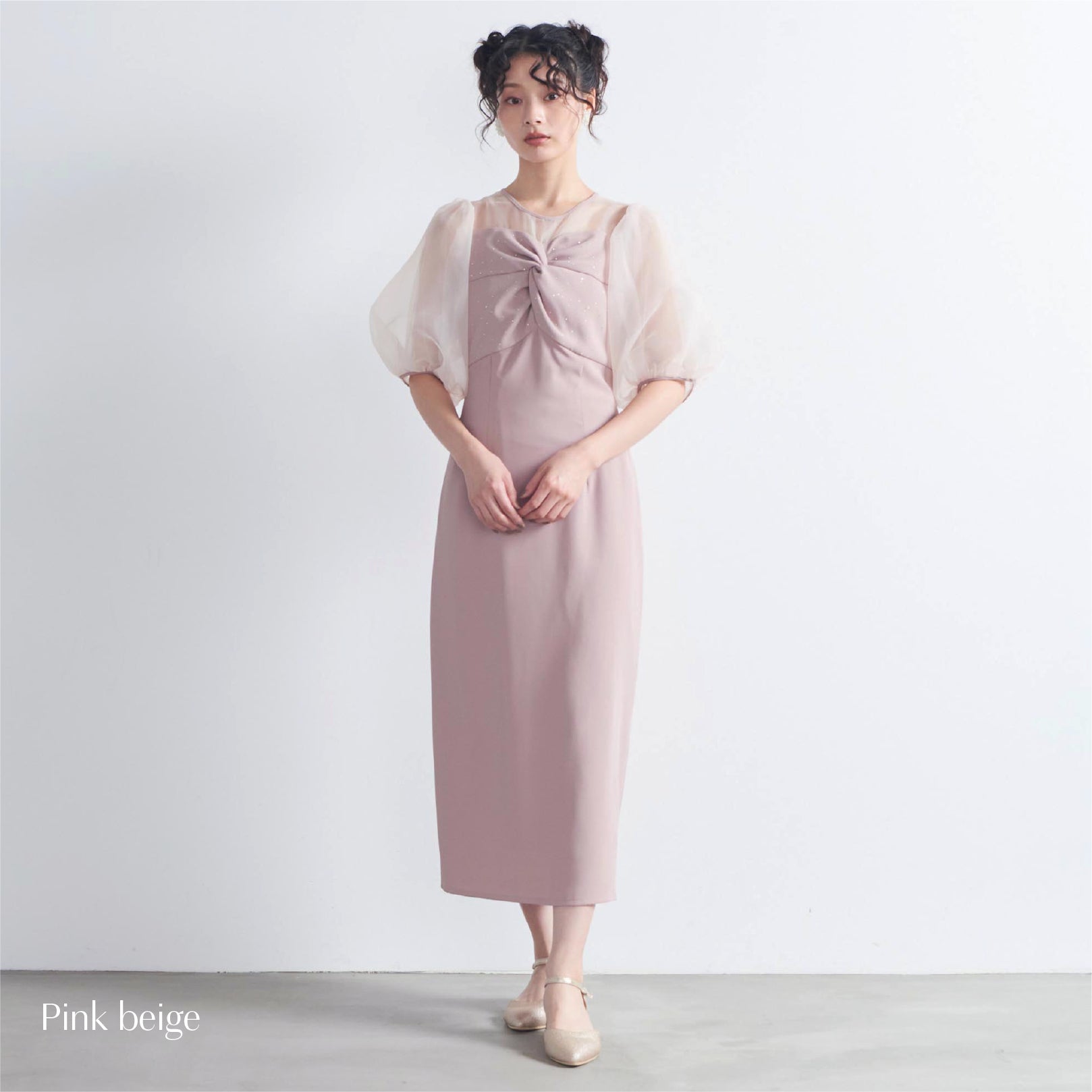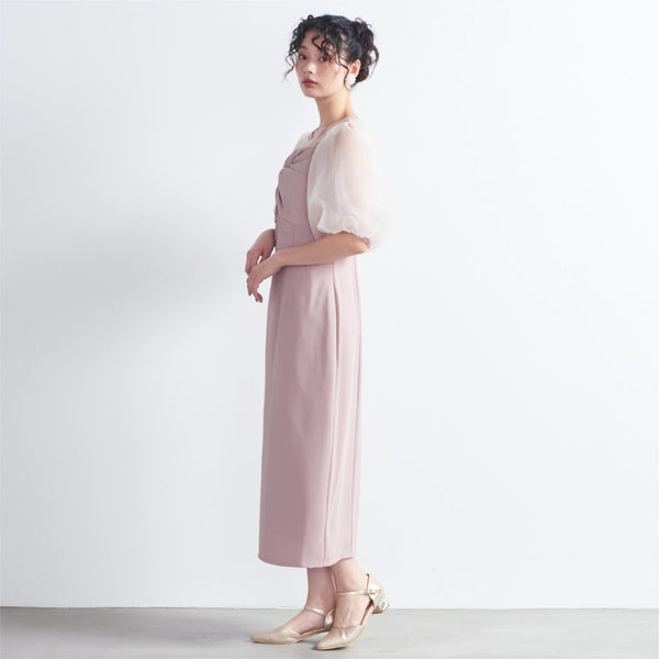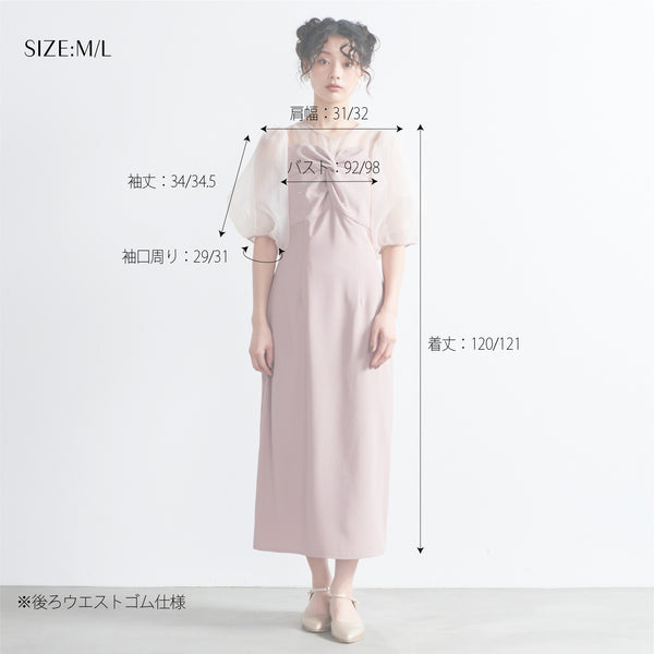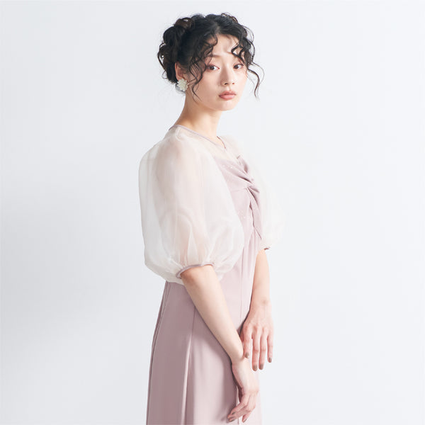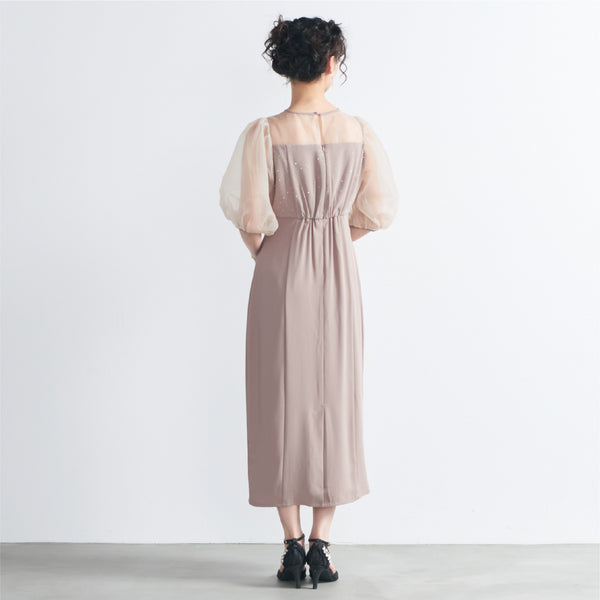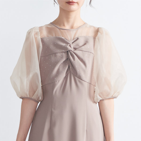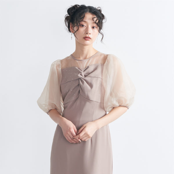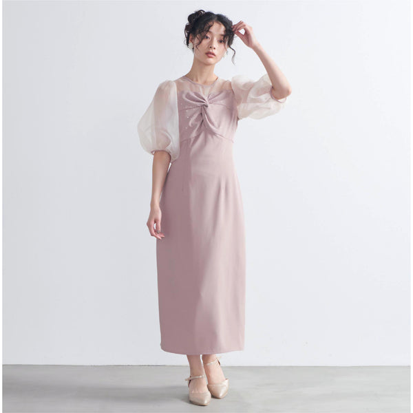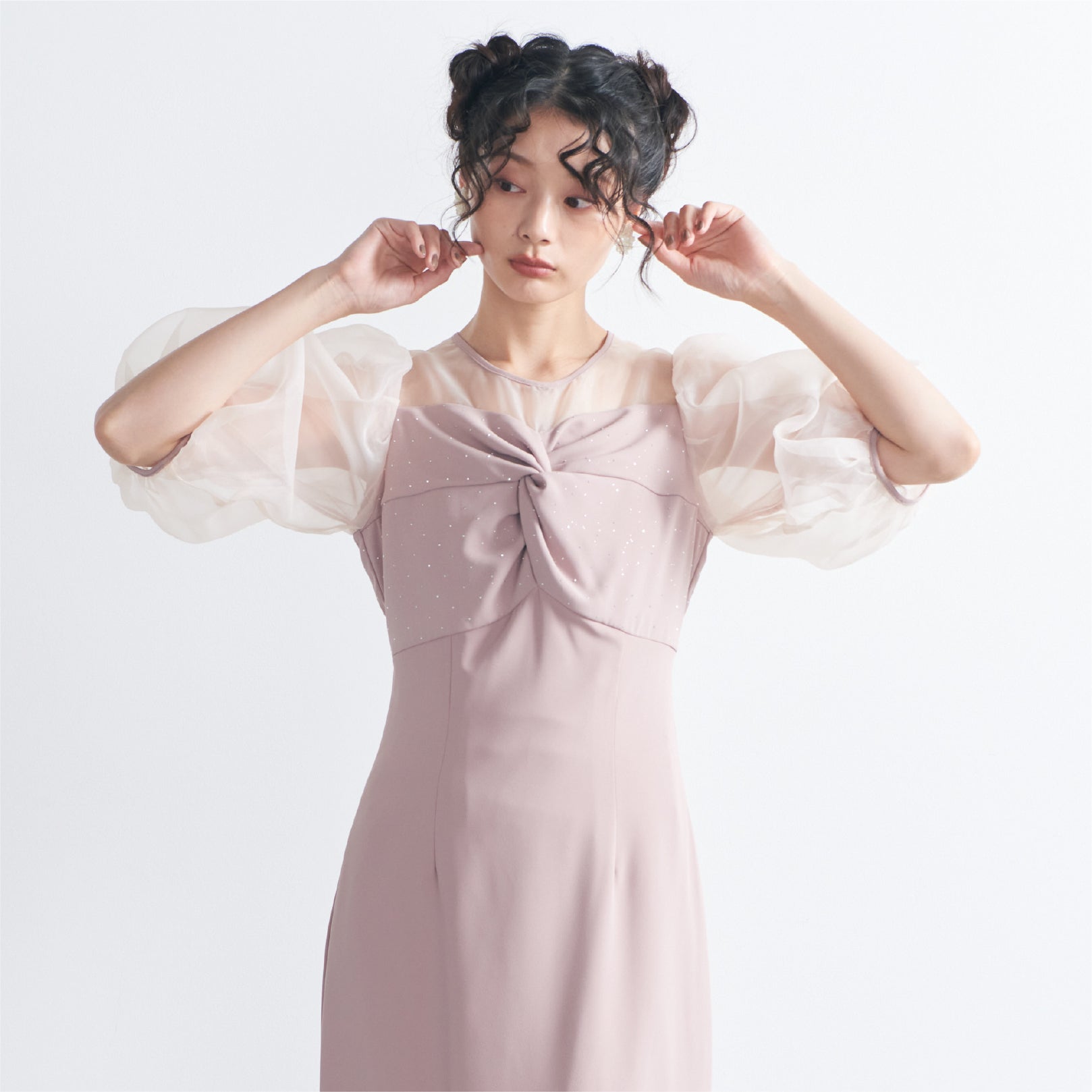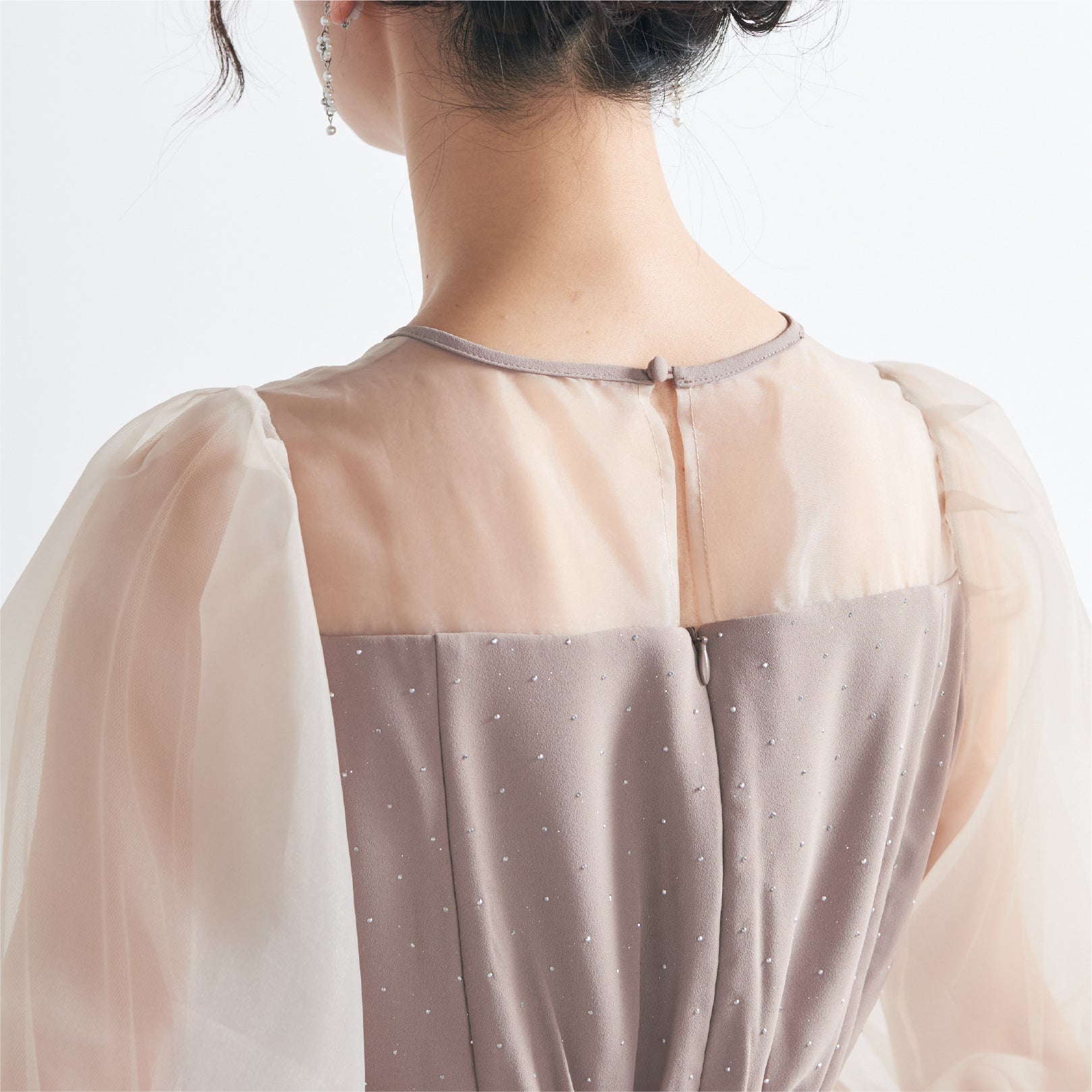 ふんわりとしたオーガンジーのパフスリーブと、胸元の華やかなデザインが印象的なIラインシルエットのドレスワンピース。