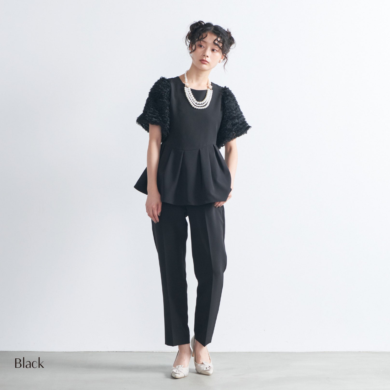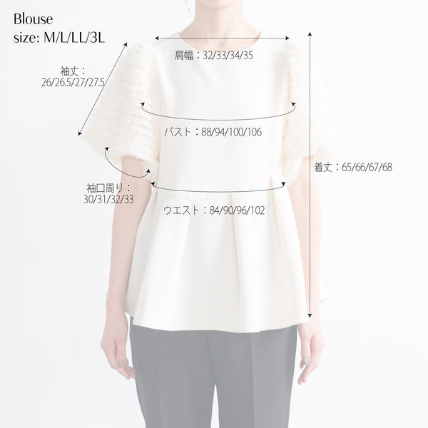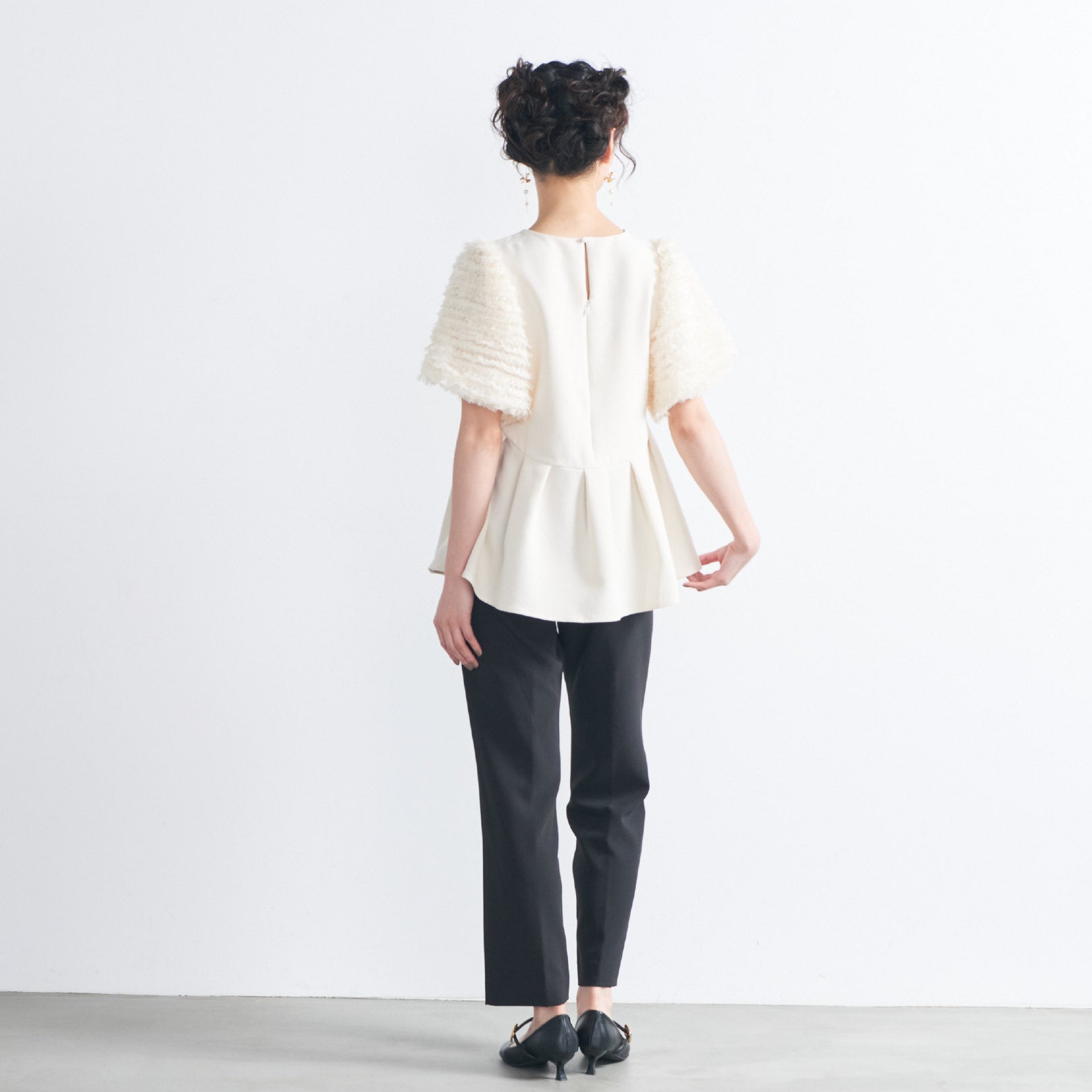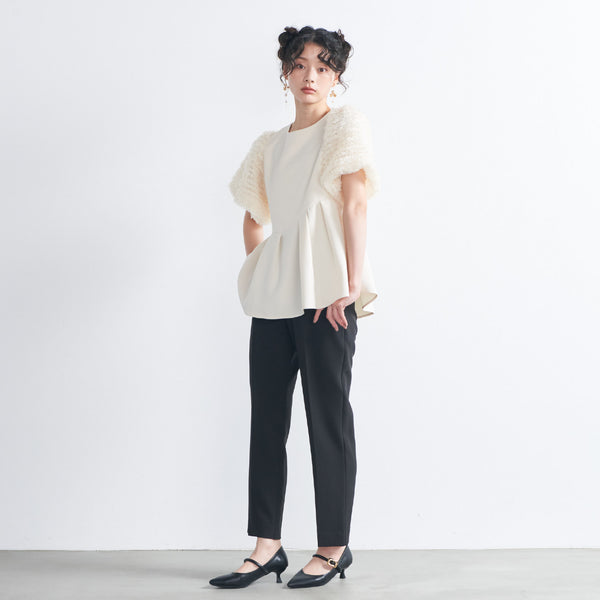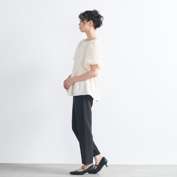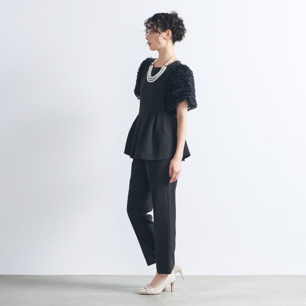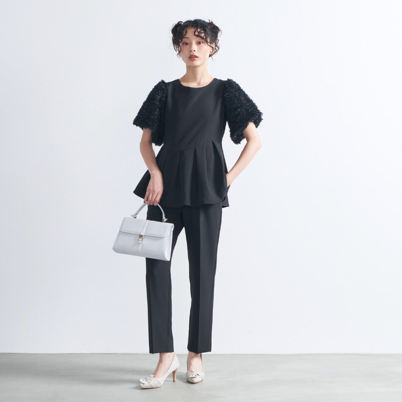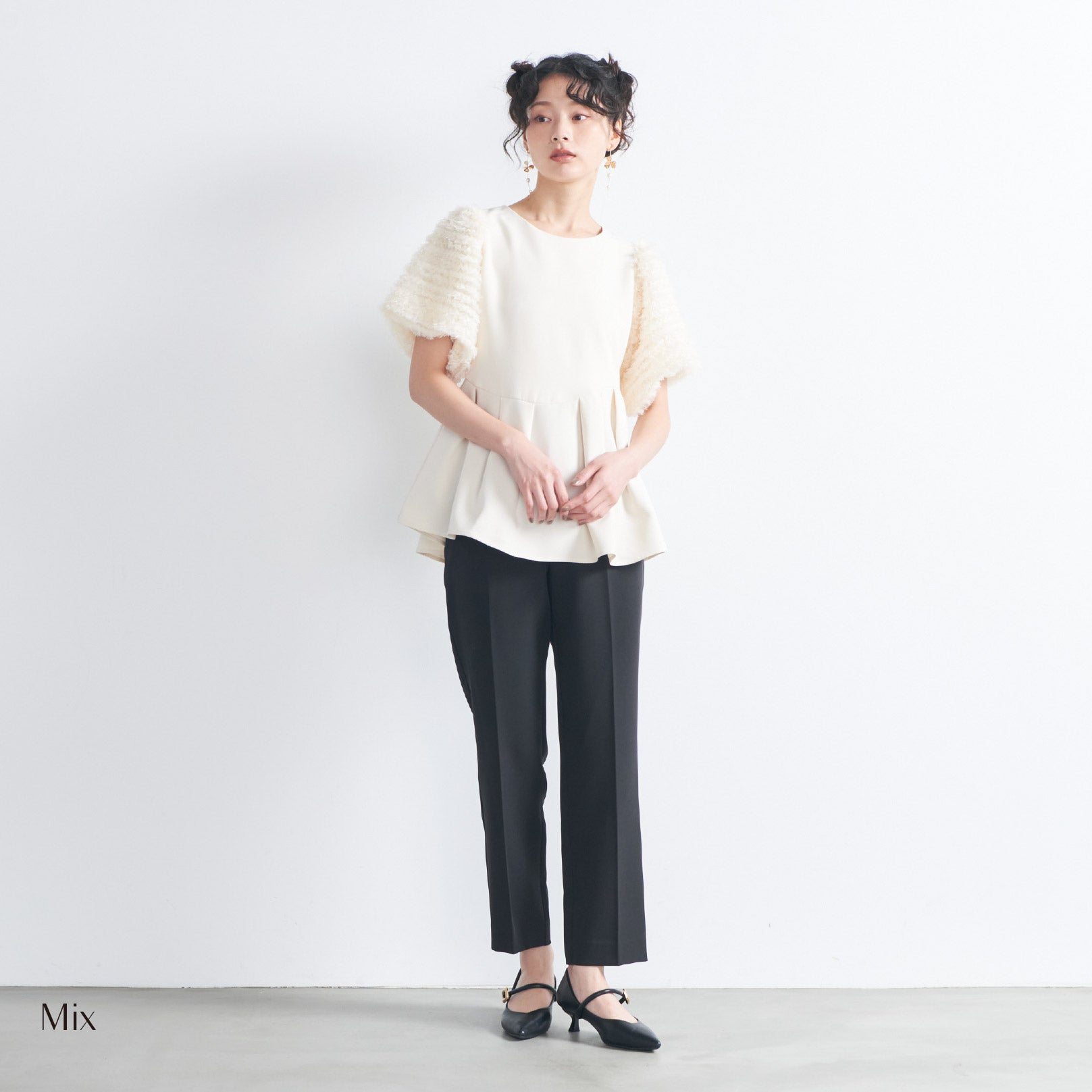 柔らかく立体感のある生地を使用したパフスリーブがポイントのセットアップです。