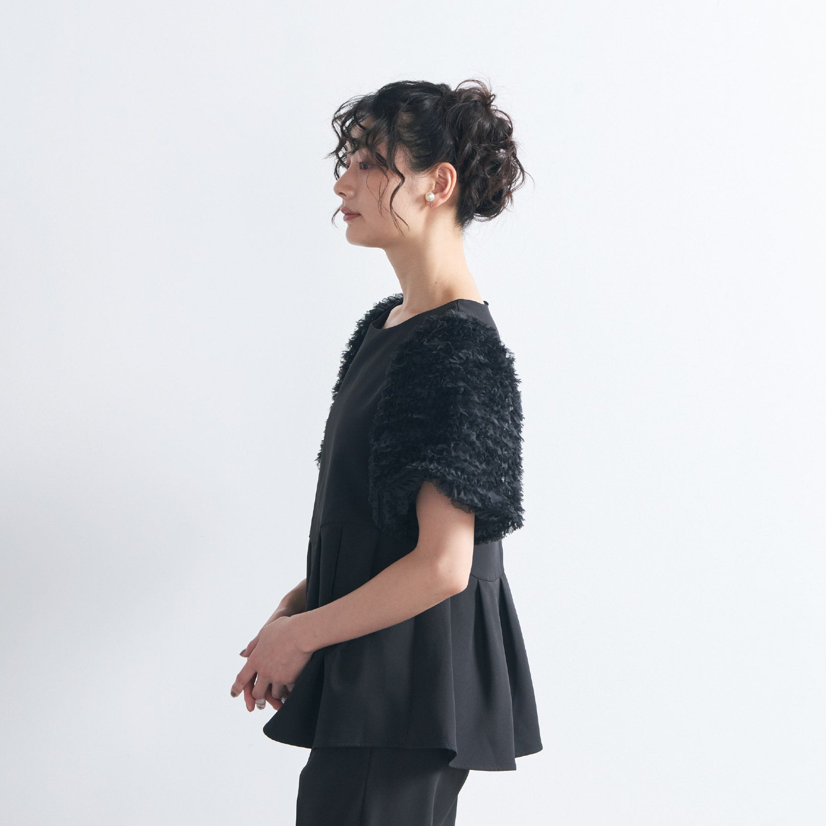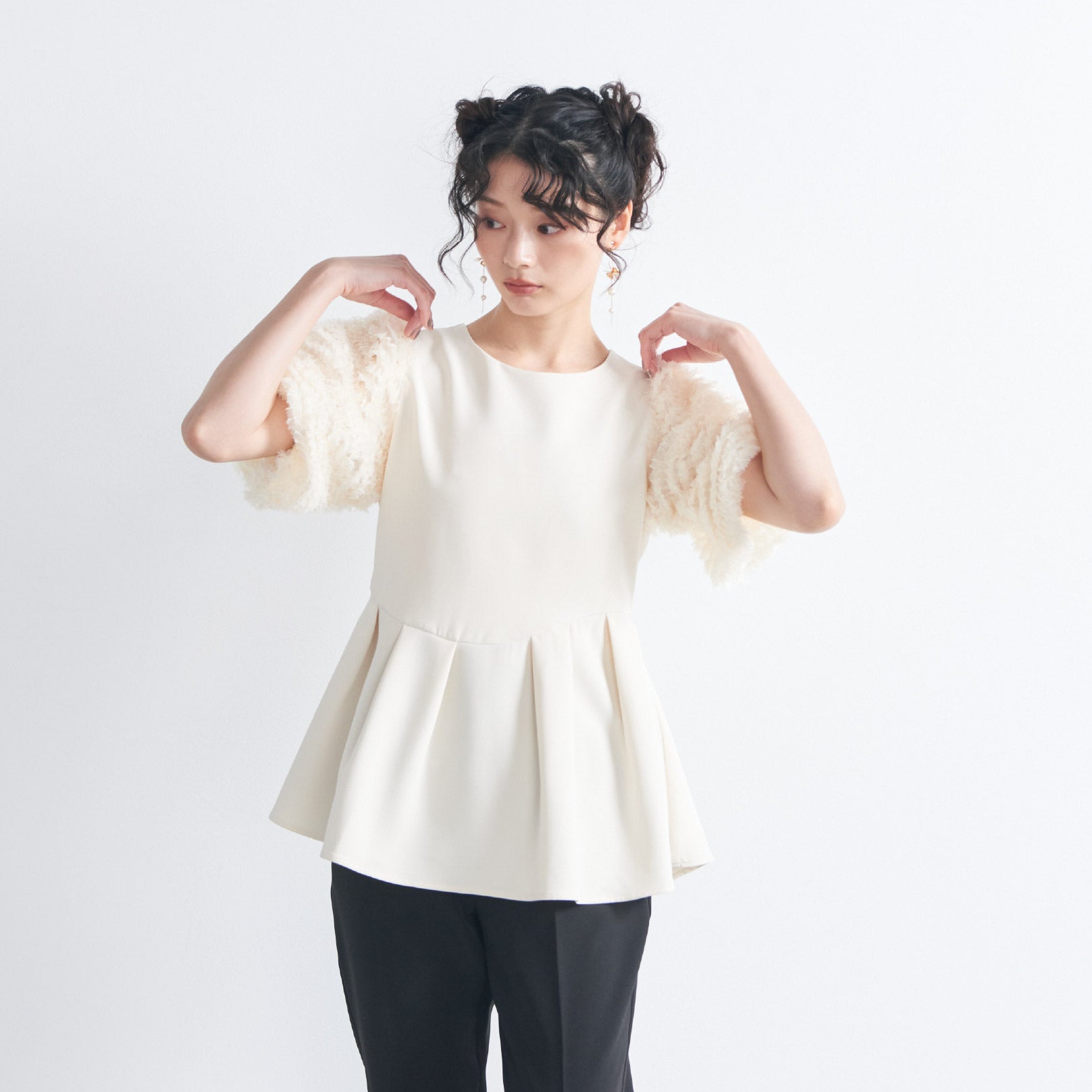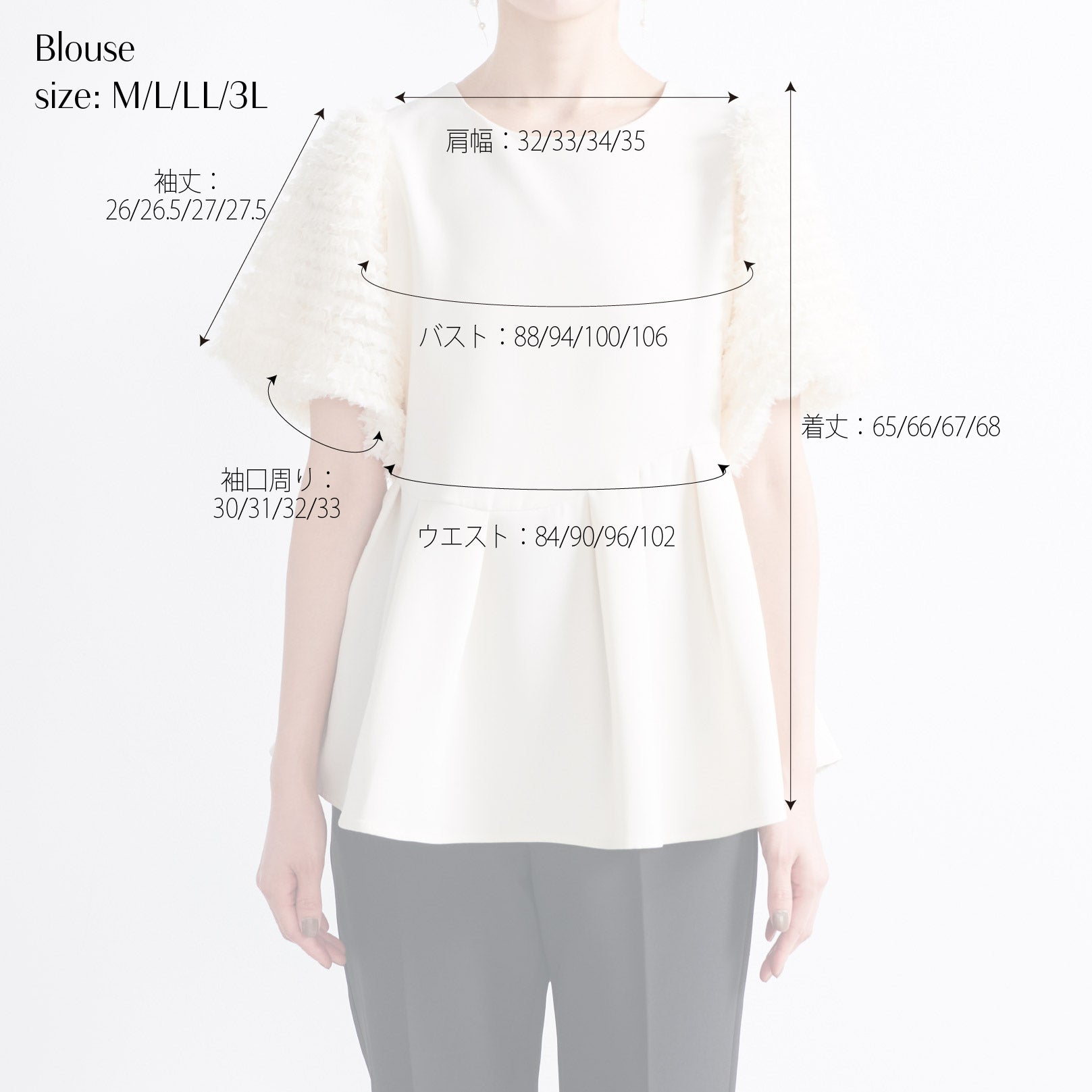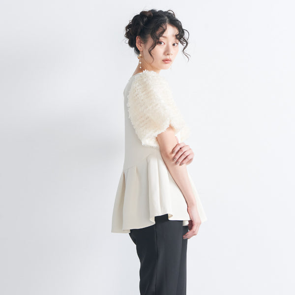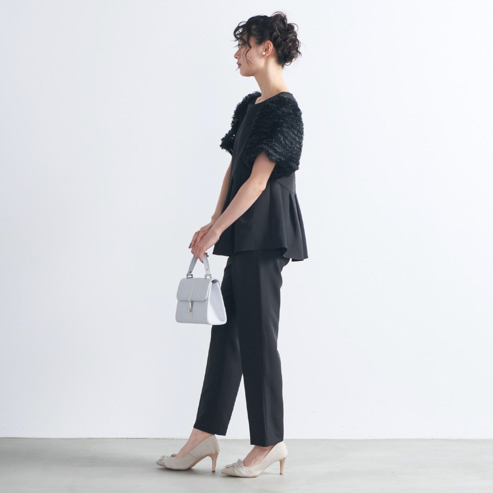 柔らかく立体感のある生地を使用したパフスリーブがポイントのセットアップです。
