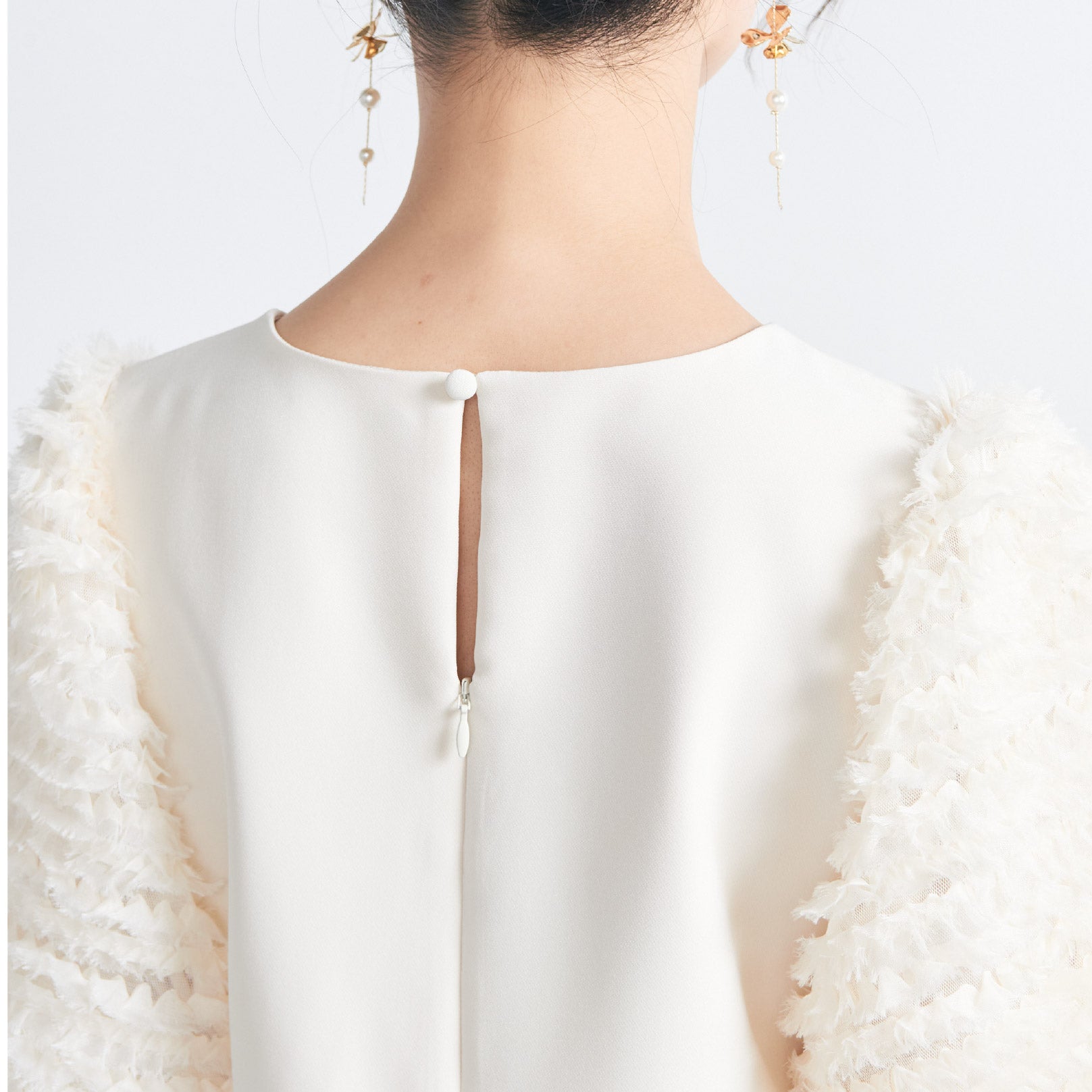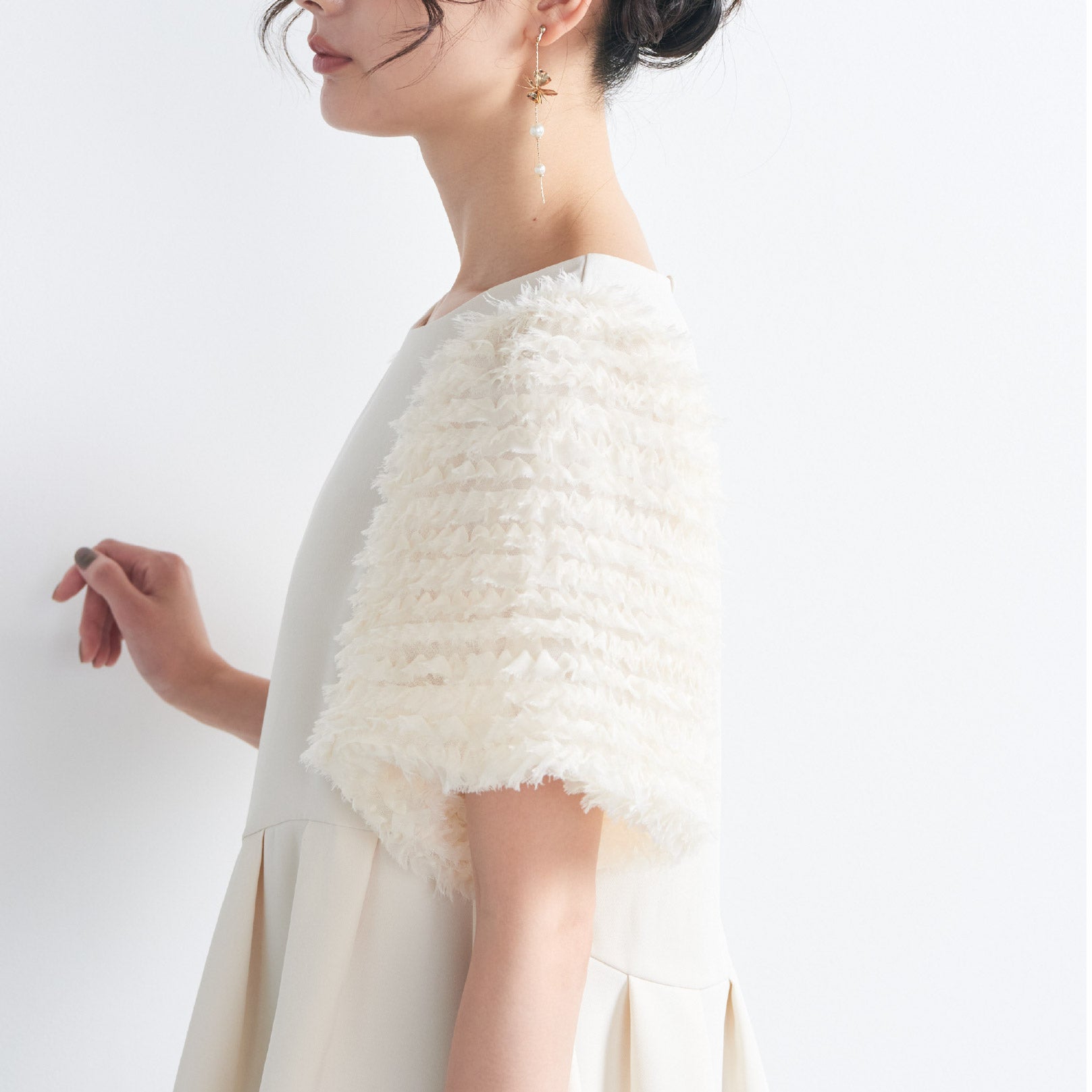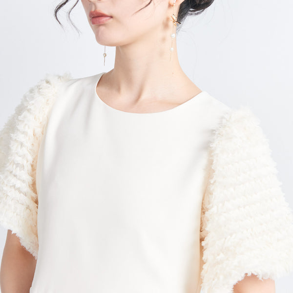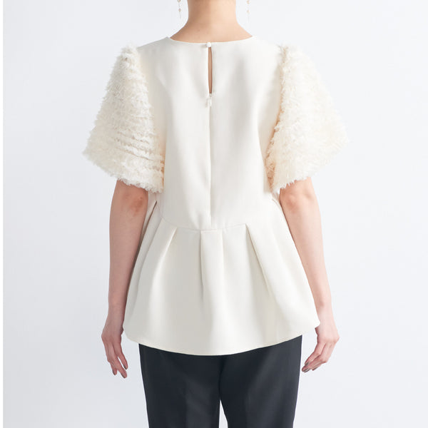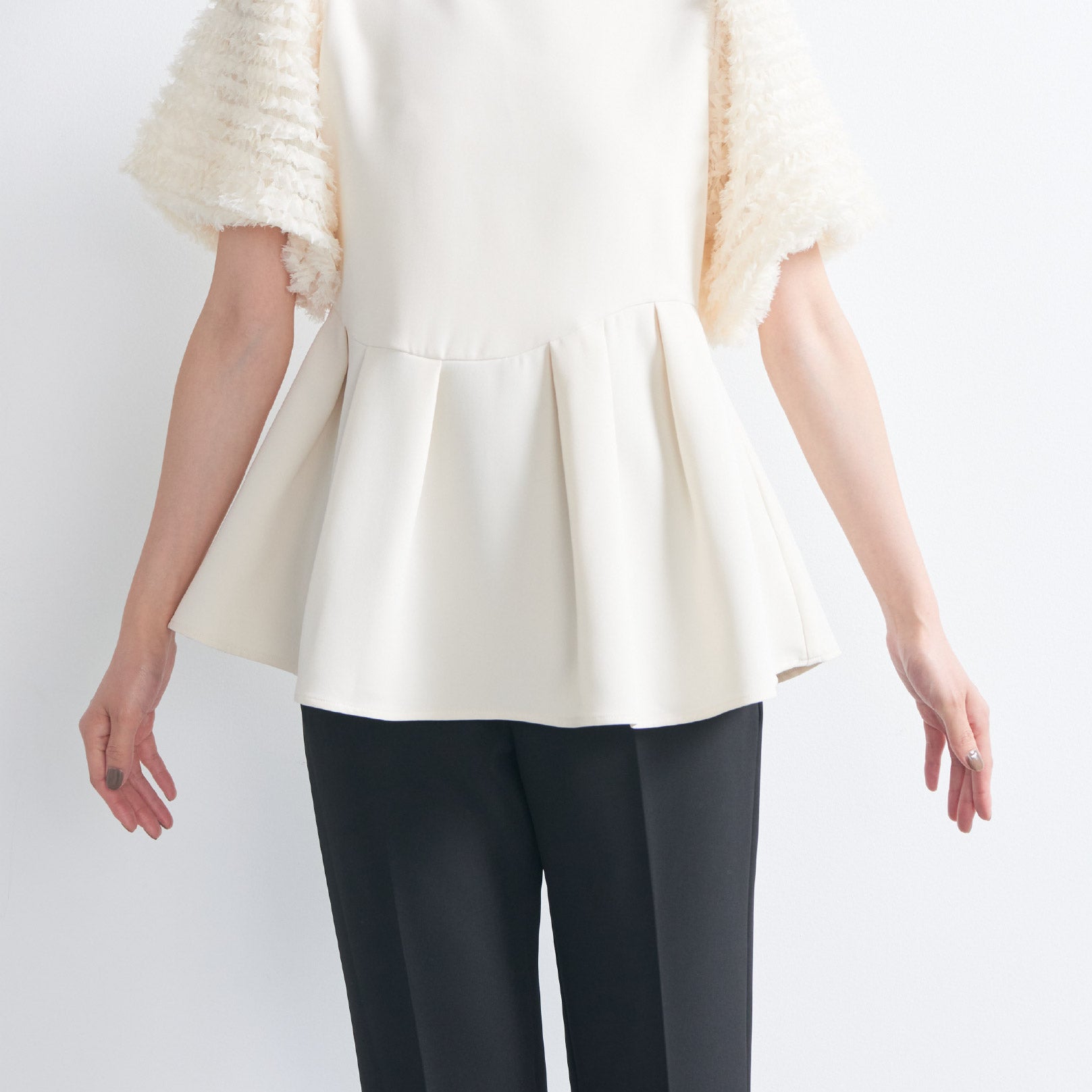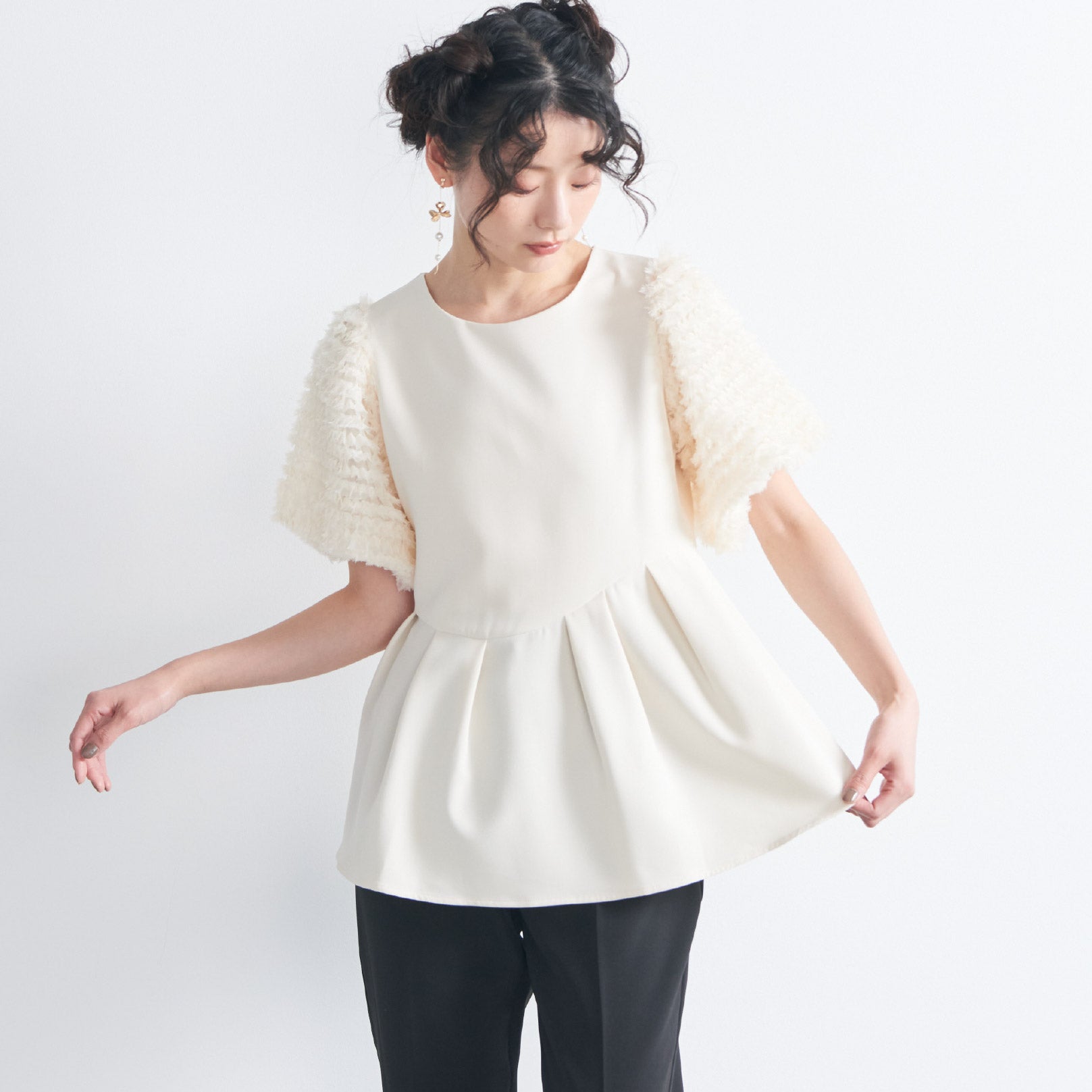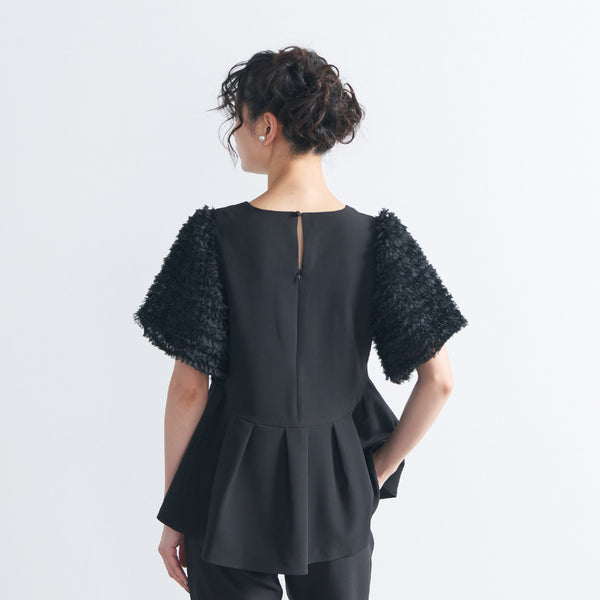 柔らかく立体感のある生地を使用したパフスリーブがポイントのセットアップです。